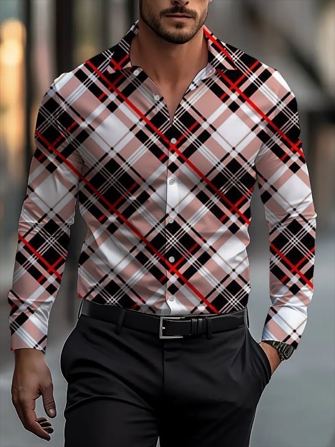 Men's Classic Business Plaid Stripe Print Long Sleeve Shirt