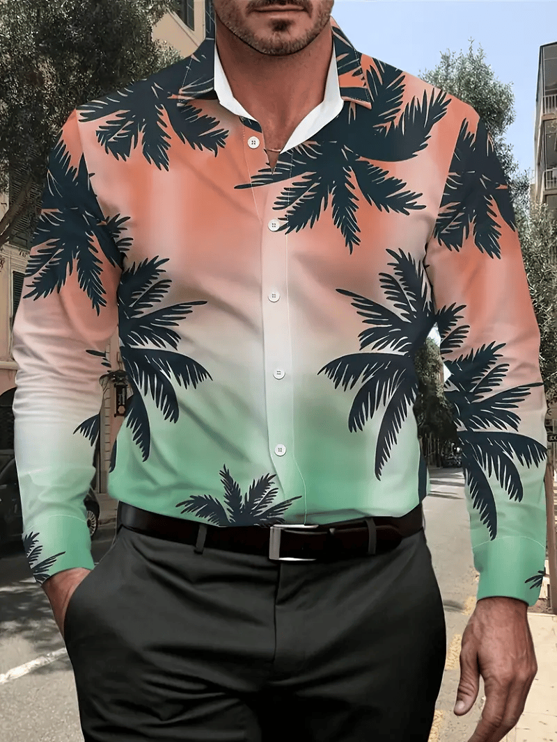 Men's Casual Hawaiian Coconut Tree Long Sleeve Lapel Shirt