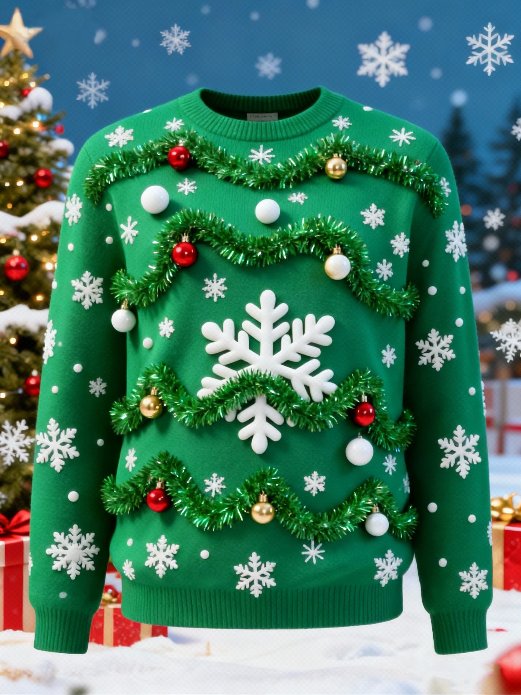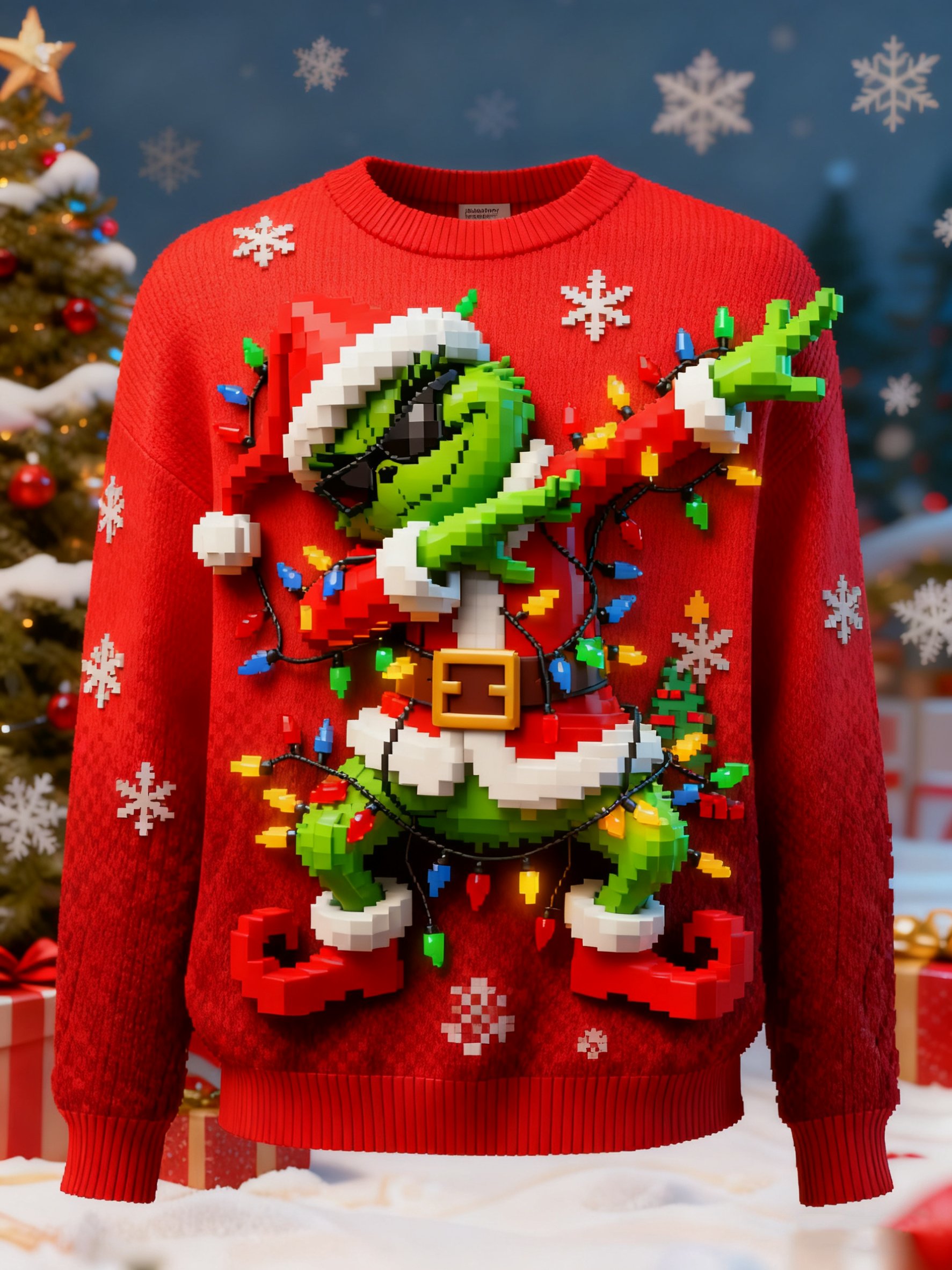 Men's Cartoon Print Ugly Christmas Green Monster Pullover Sweater