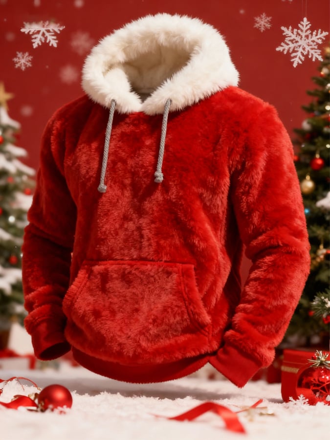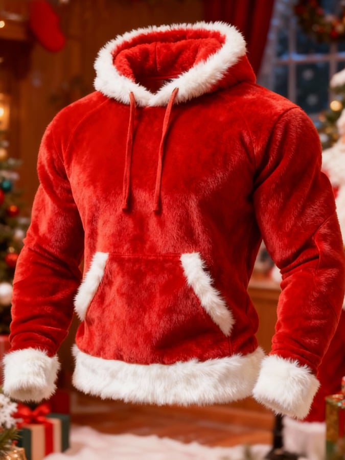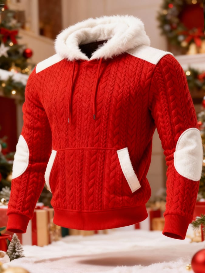 Men's Warm Plush Stitching Contrast Color Christmas Hooded Sweatshirt