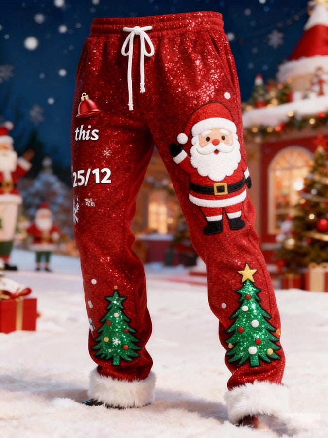 Men's Christmas Patchwork Furry Sequin Print Casual Pants