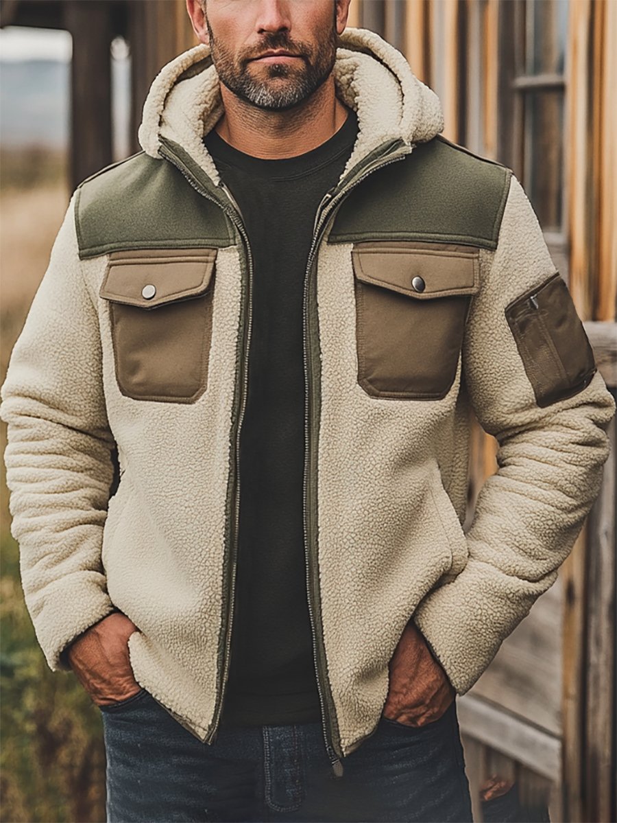 Men's Vintage Suede Patchwork Lamb Fleece Multi-Pocket Reverse Collar Outdoor Jacket Coat