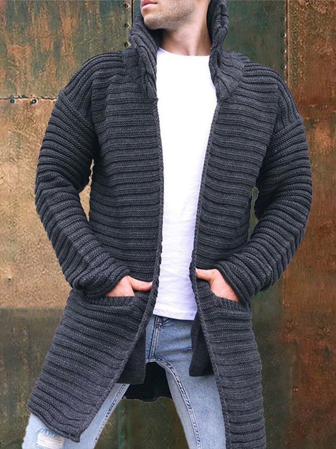 Men's Casual Pocket Turtleneck Rib-Knit Long Cardigan Sweater Coat