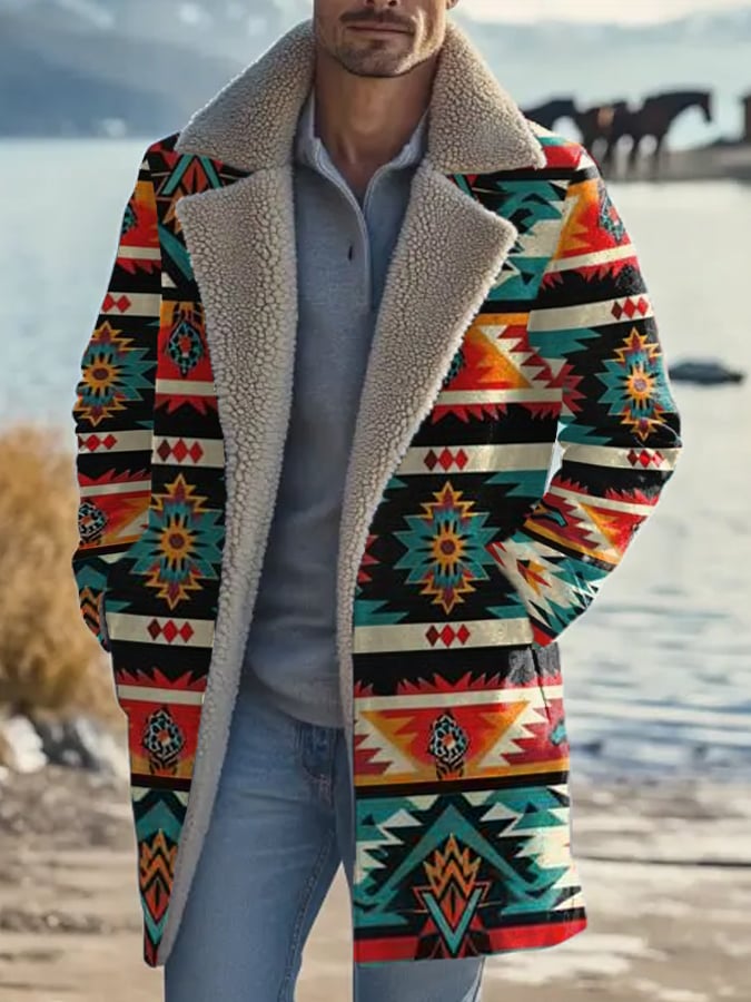 Men's Retro Western Aztec Bufflo Print Plush Coat