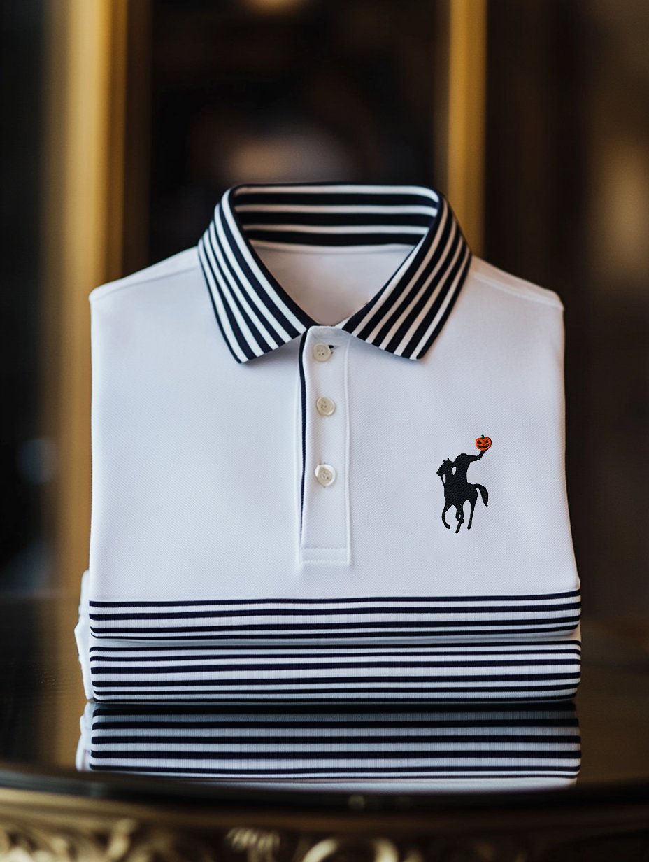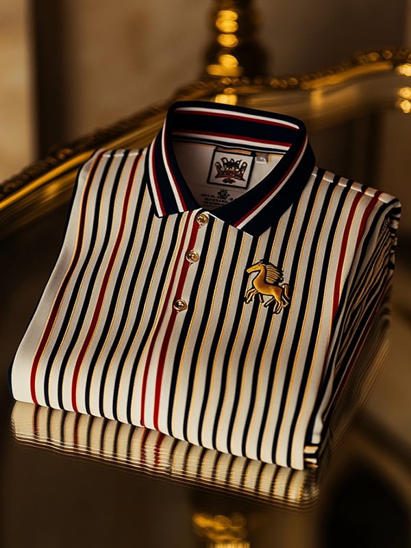 Men's Classic Business Wave Stripe Logo Button Short Sleeve Polo Shirt