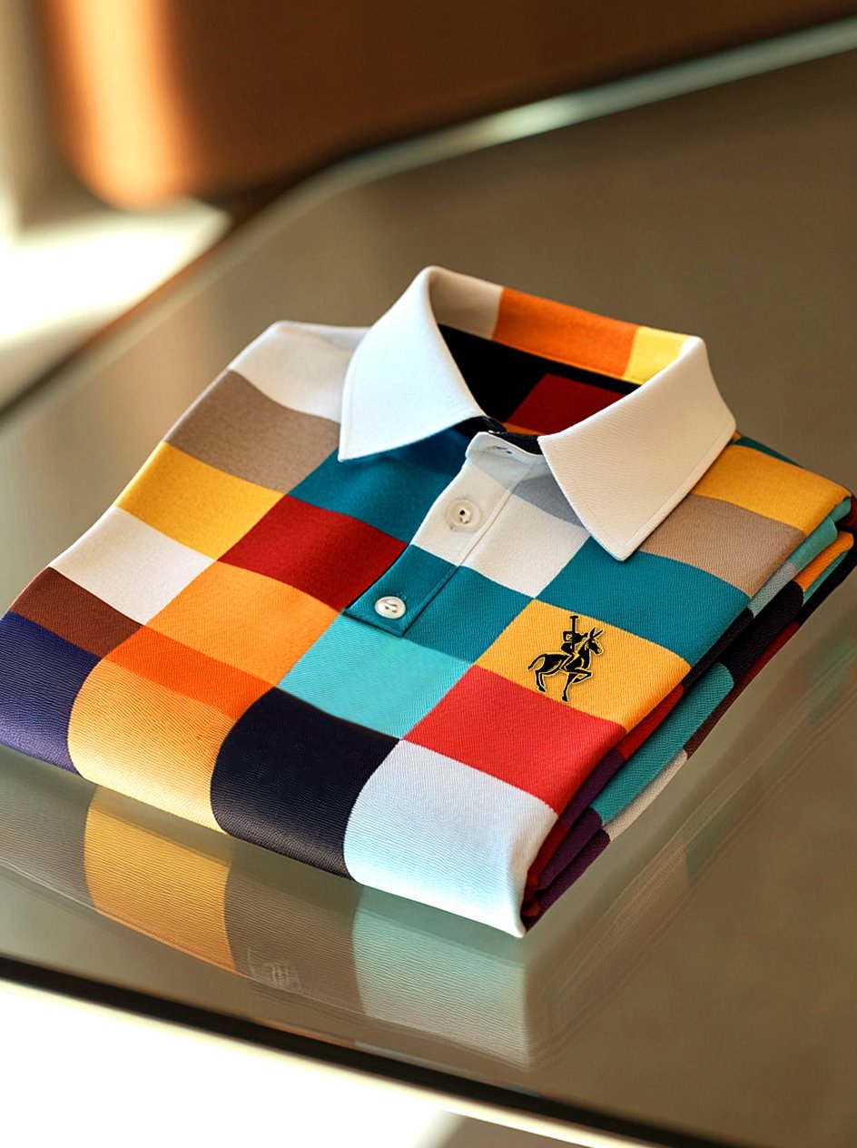 Men's Classic Business Check Logo Button Short Sleeve Polo Shirt