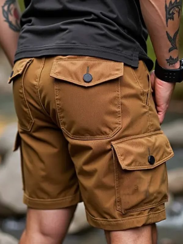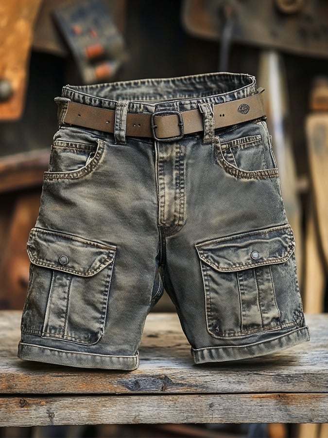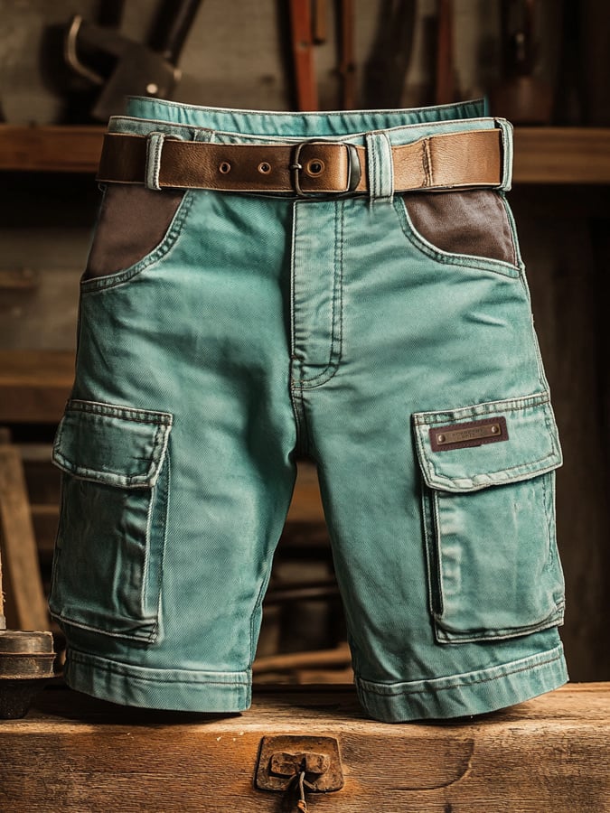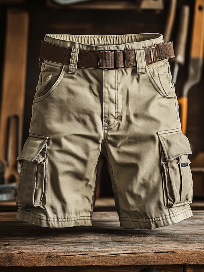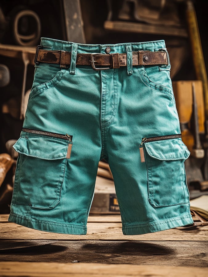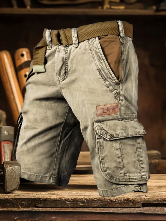 Men's Vintage Outdoor Pocket Functional Washed Distressed Leather Label Work Shorts