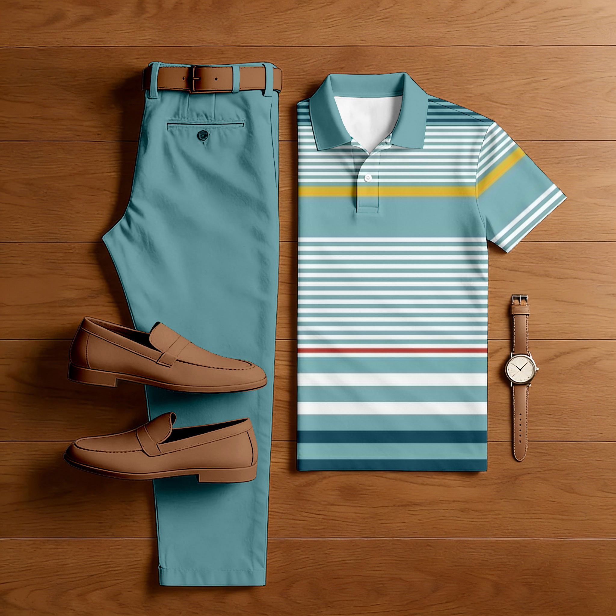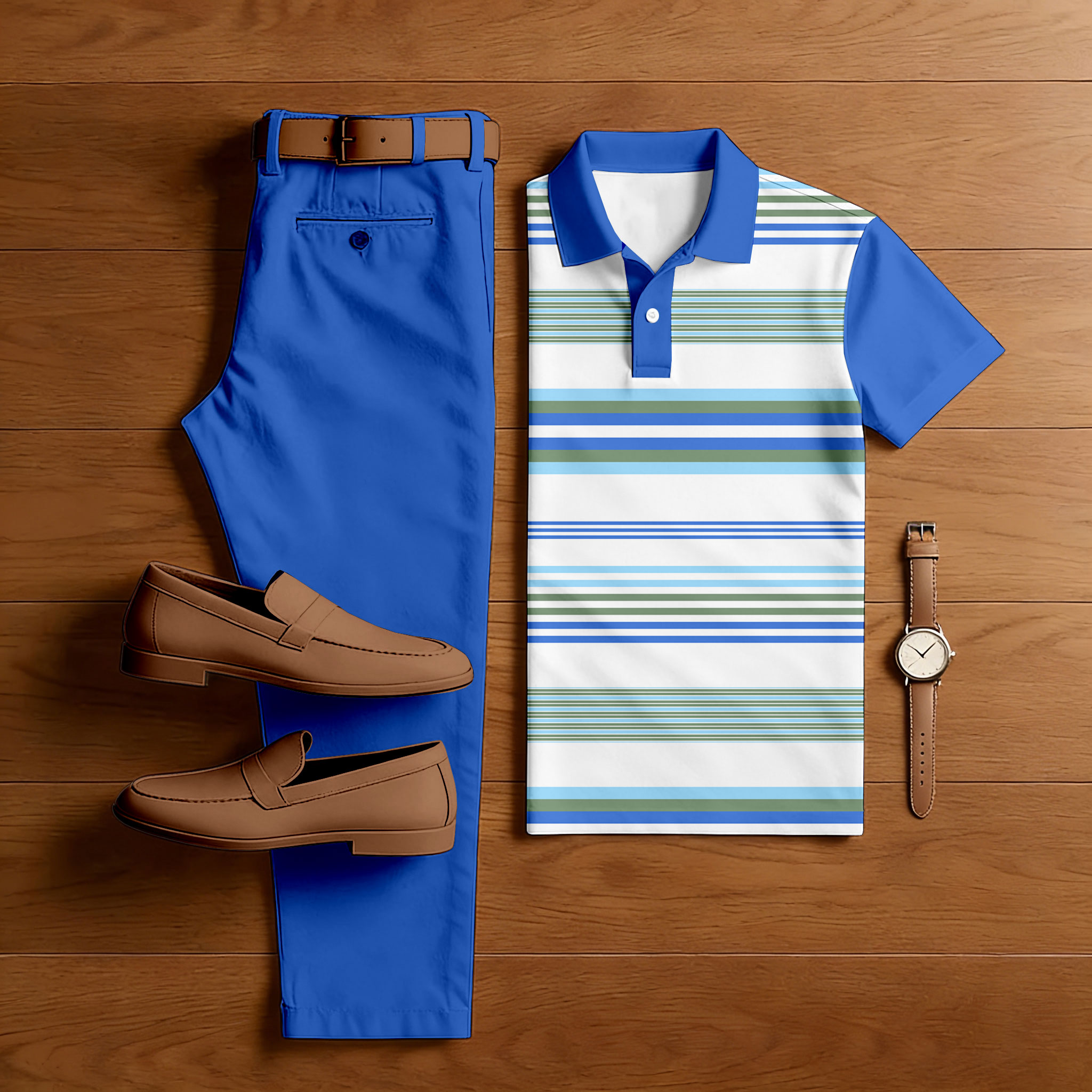 Men's Casual Blue & Khaki Color Matching Striped Printed Short Sleeved Polo Shirt & Trousers Two-Piece Set