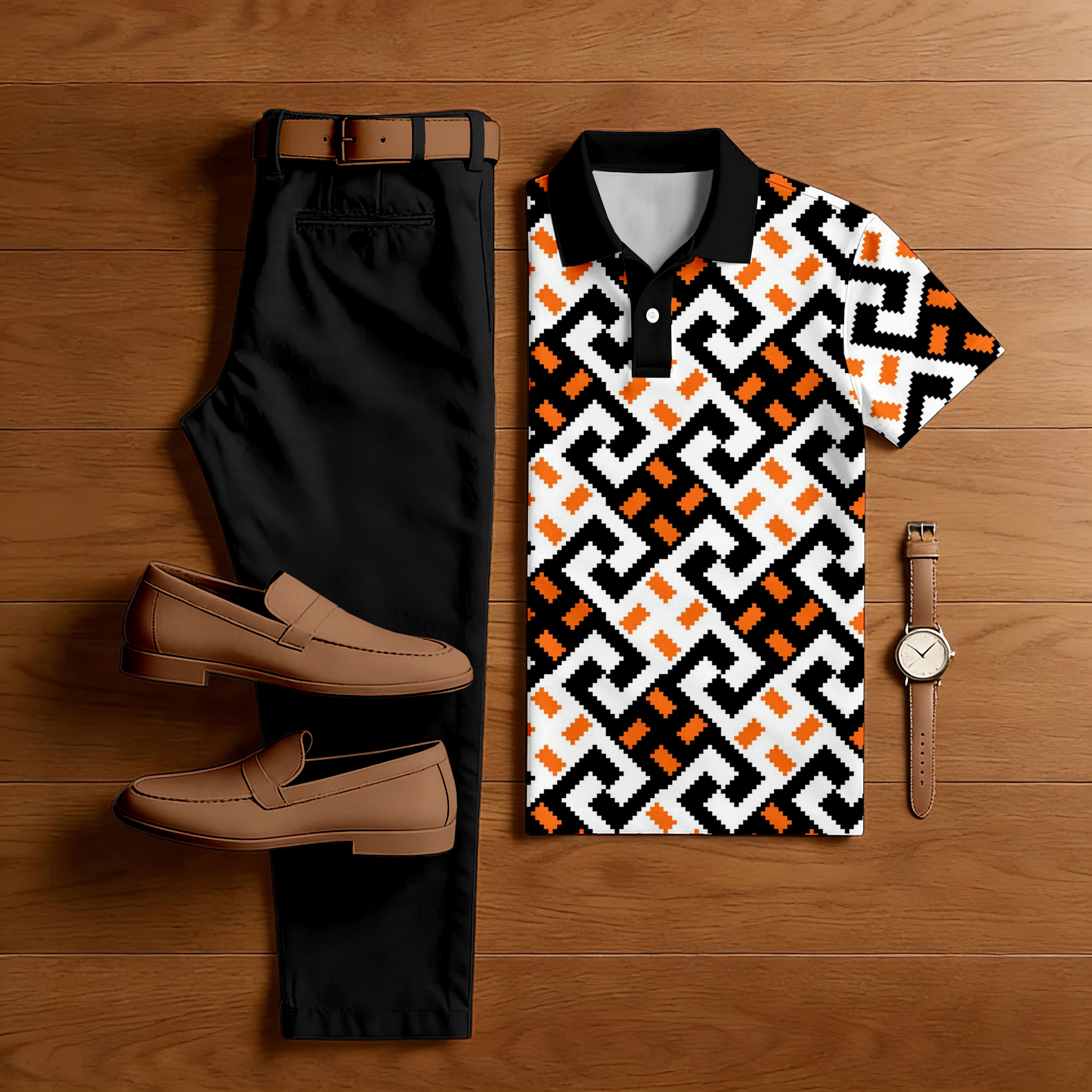 Men's Casual Brown & Khaki Color Matching Art Printed Short Sleeved Polo Shirt & Trousers Two-Piece Set