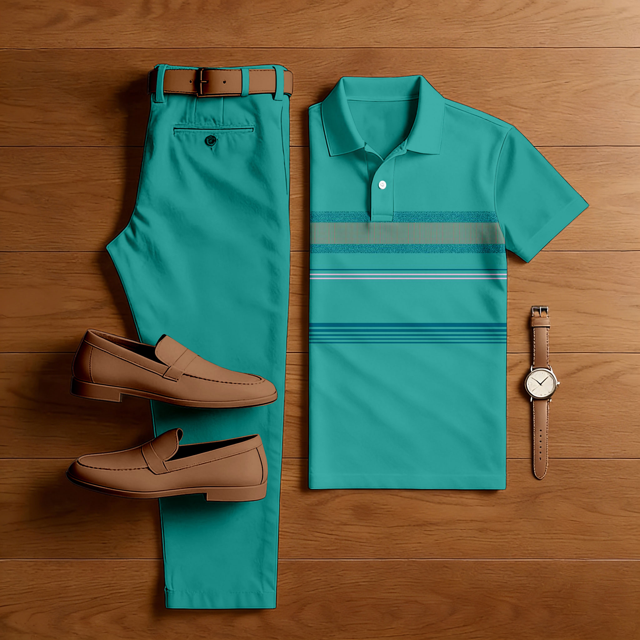Men's Casual Green & Light Blue Color Matching Striped Printed Short Sleeved Polo Shirt & Trousers Two-Piece Set