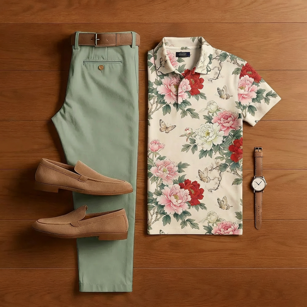 Men's Casual Apricot Rose Print Short-Sleeved Shirt And Trousers Two-Piece Set
