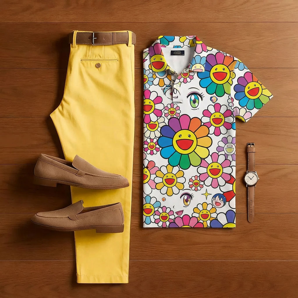 Men's Casual Apricot Maple Leaf Print Polo Shirt And Trousers Two-Piece Set