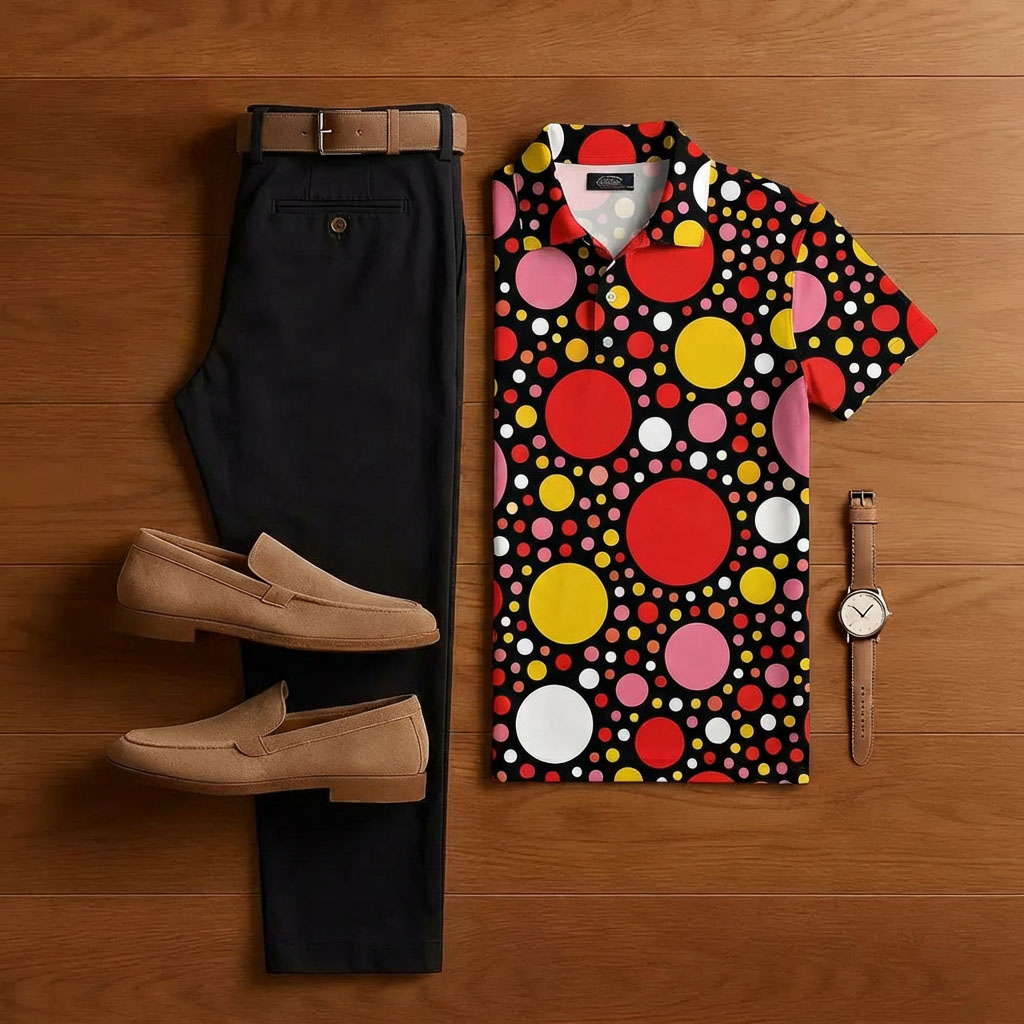 Men's Casual Black & White Color Matching Retro Style Printed Short Sleeved Polo Shirt & Trousers Two-Piece Set