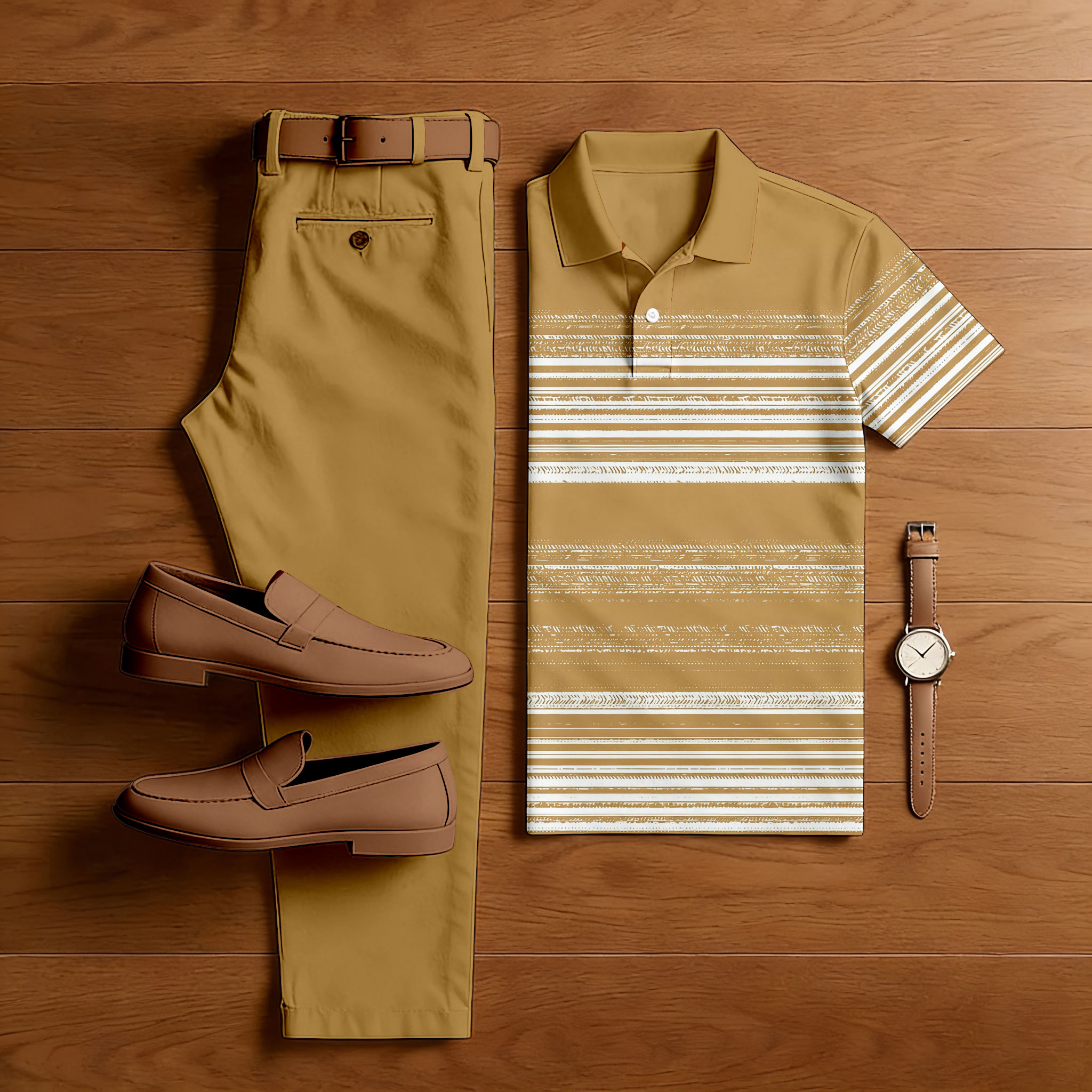 Men's Casual Apricot & Multi Color Matching Striped Printed Short Sleeved Polo Shirt & Trousers Two-Piece Set