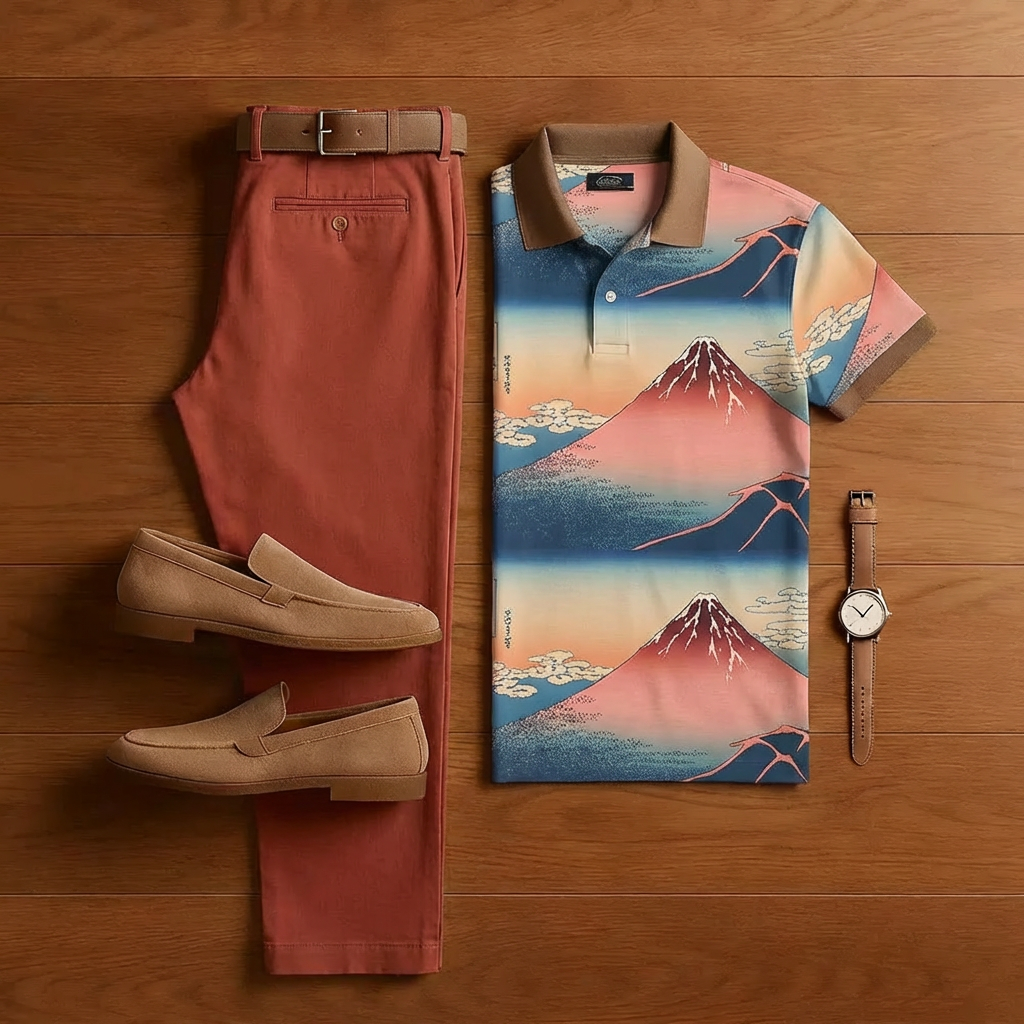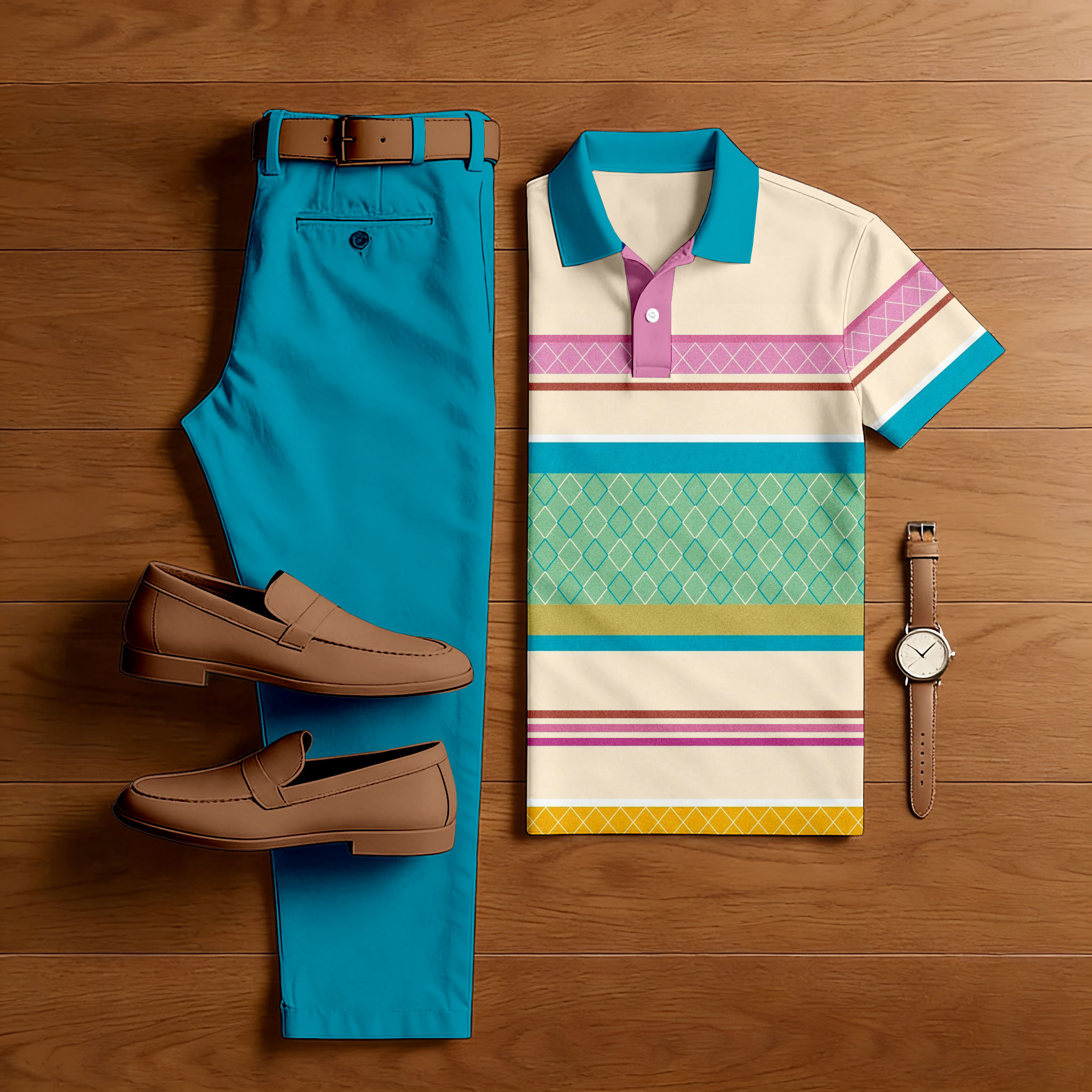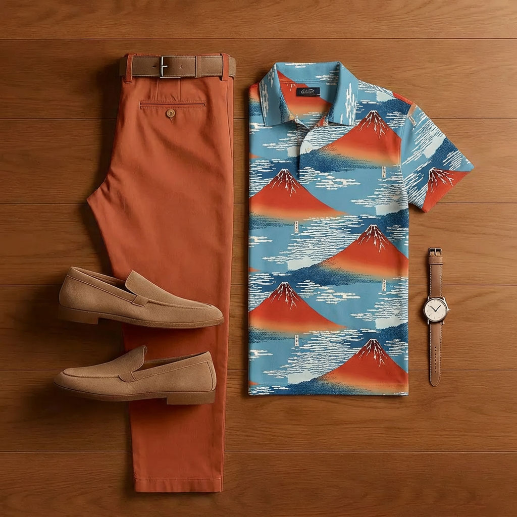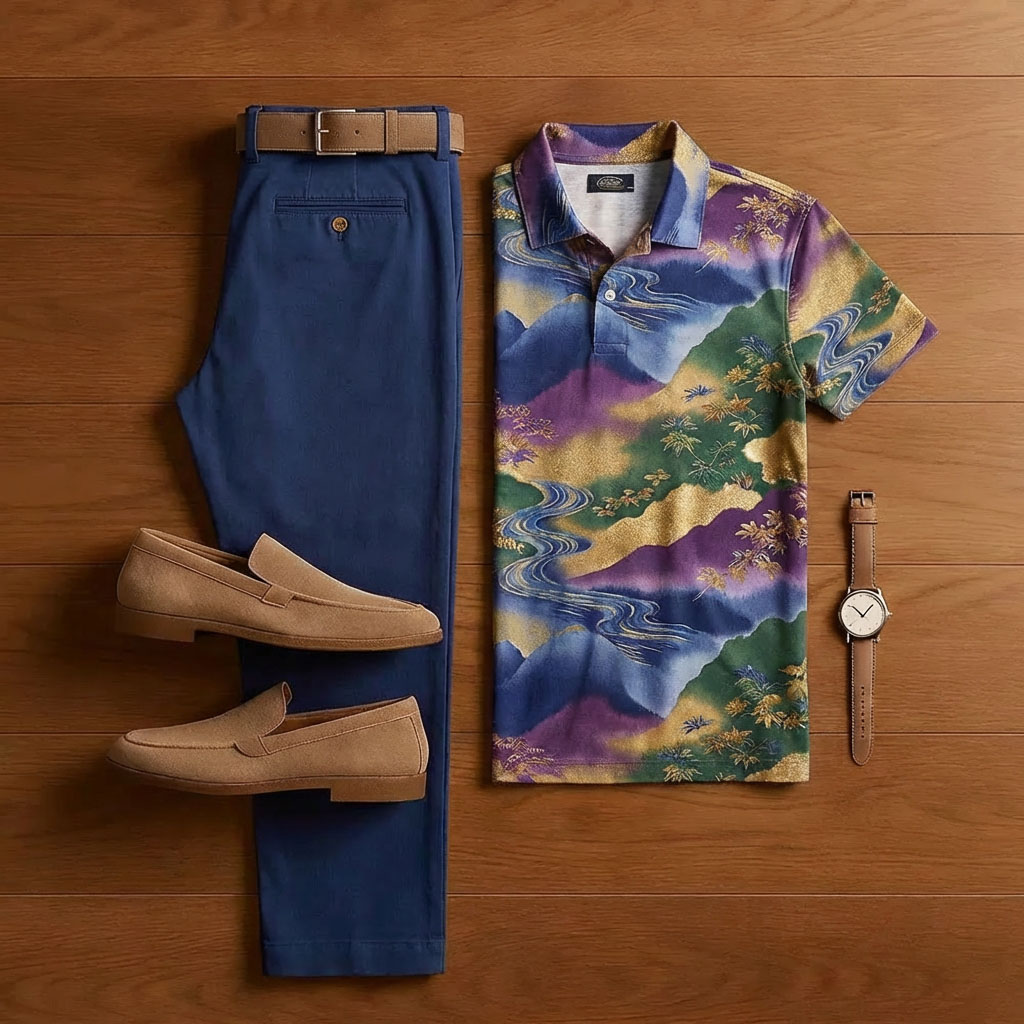 Men's Casual Tan & Blue Color Matching Retro Style Printed Short Sleeved Polo Shirt & Trousers Two-Piece Set