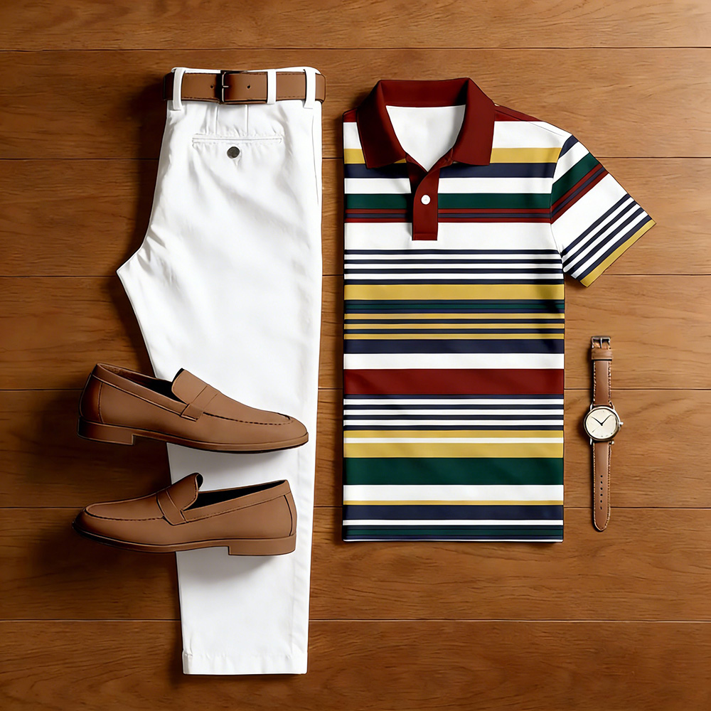 Men's Casual Multi Color Matching Striped Printed Short Sleeved Polo Shirt & White Trousers Two-Piece Set