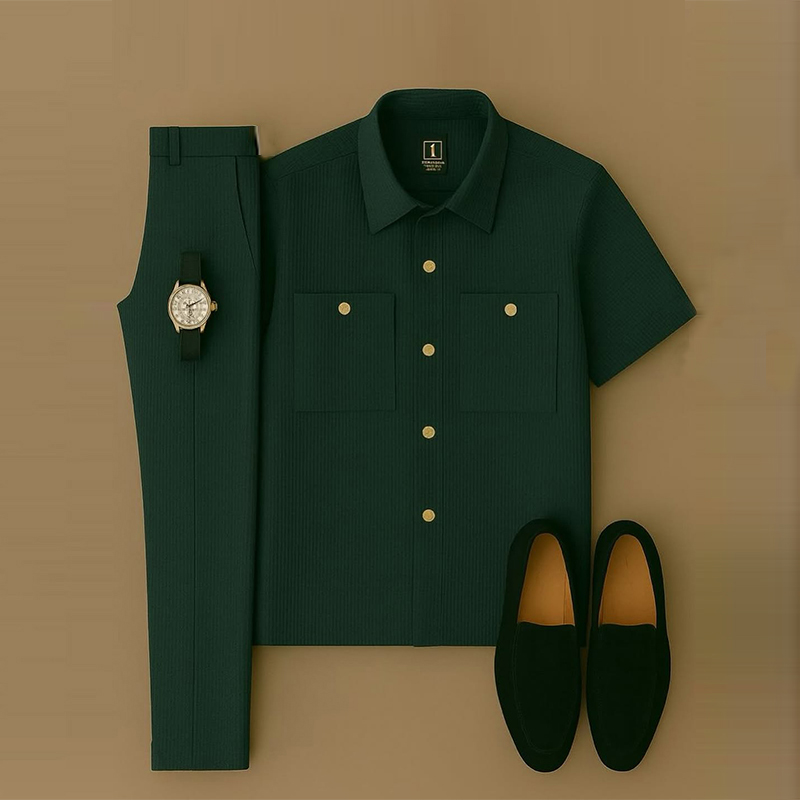 Men's Casual Dark Green Short Sleeved Lapel Collar Shirt & Trousers Two-Piece Set