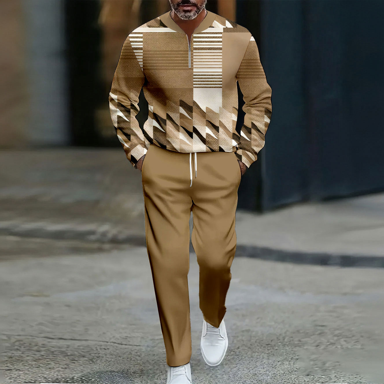 Men's Casual Blue & Apricot Color Matching Printed Polo-Collar Zipper Long Sleeved Trousers Two-Piece Set