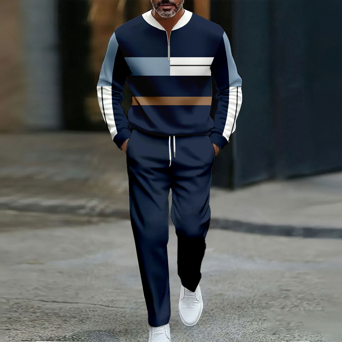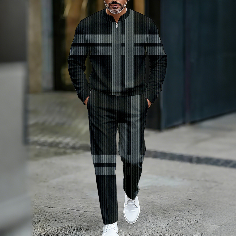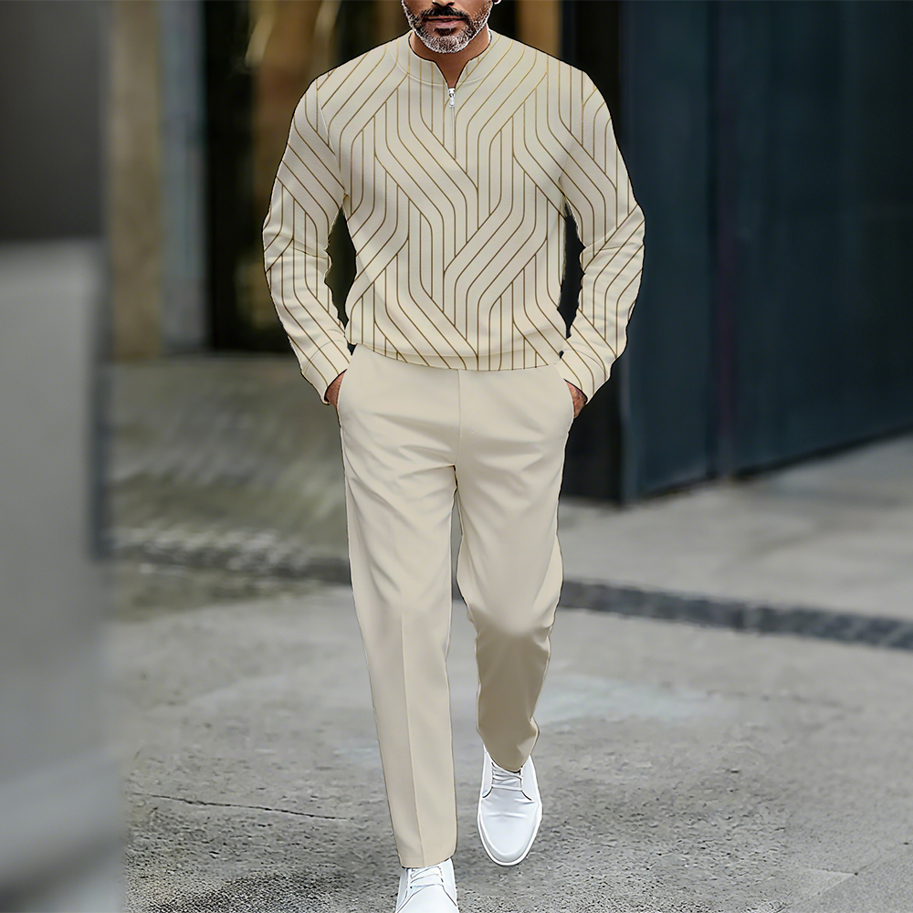 Men's Casual Color Matching Printed Round-Neck Zipper Long Sleeved Trousers Two-Piece Set