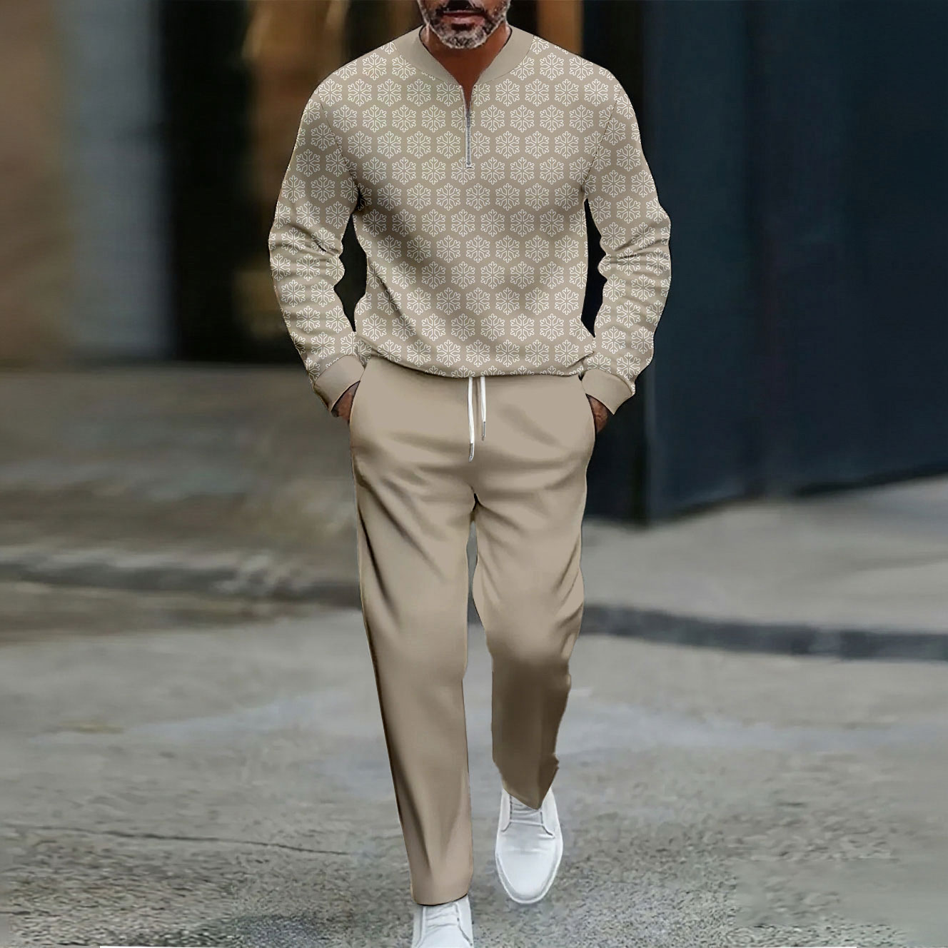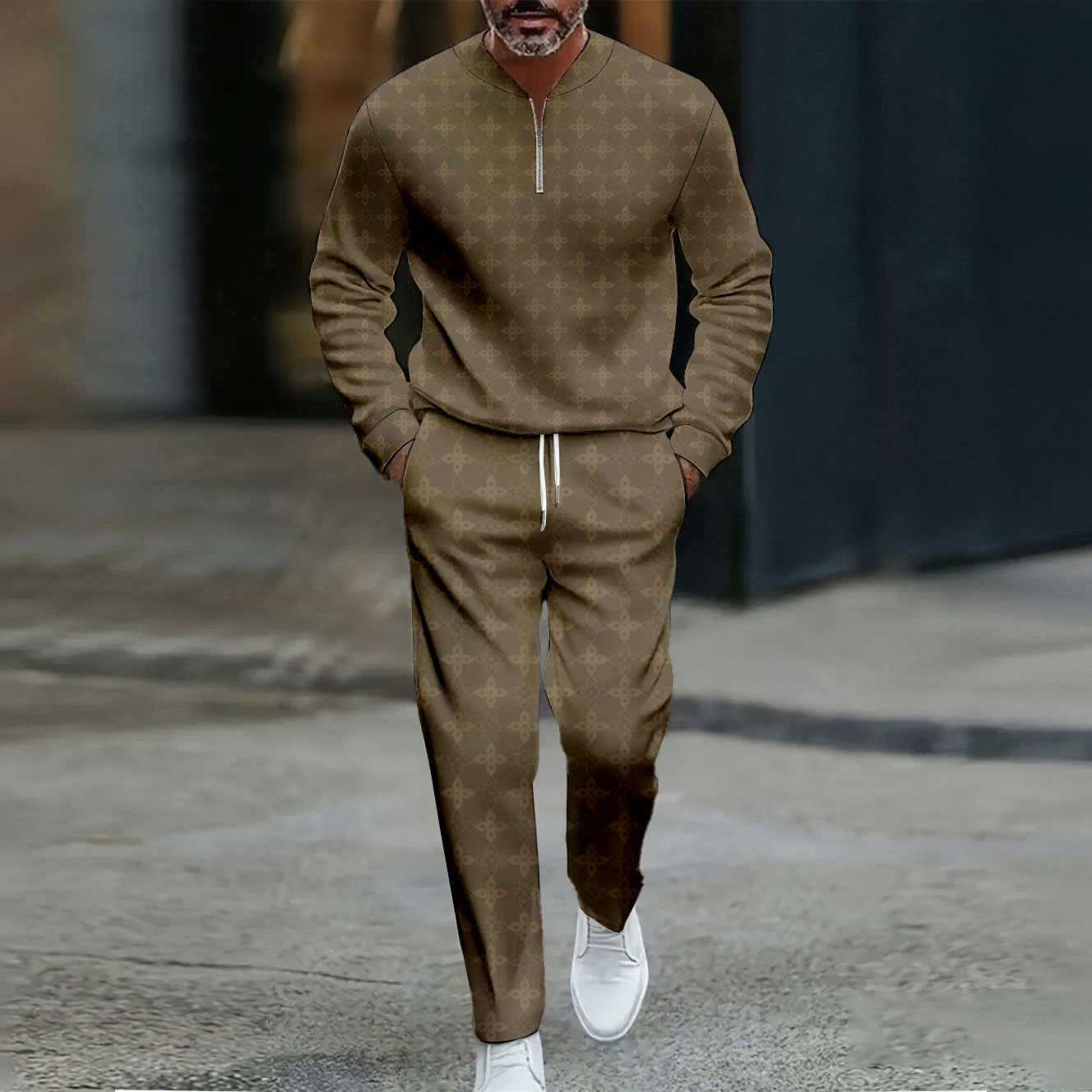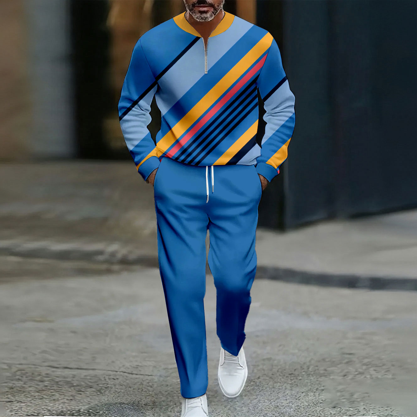 Men's Casual Color Matching Printed Round-Neck Zipper Long Sleeved Trousers Two-Piece Set