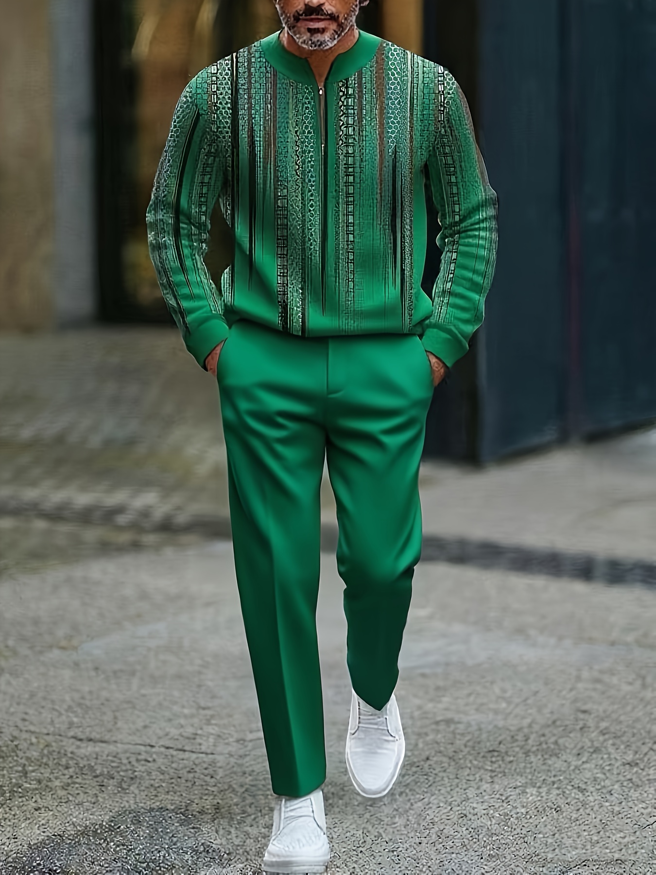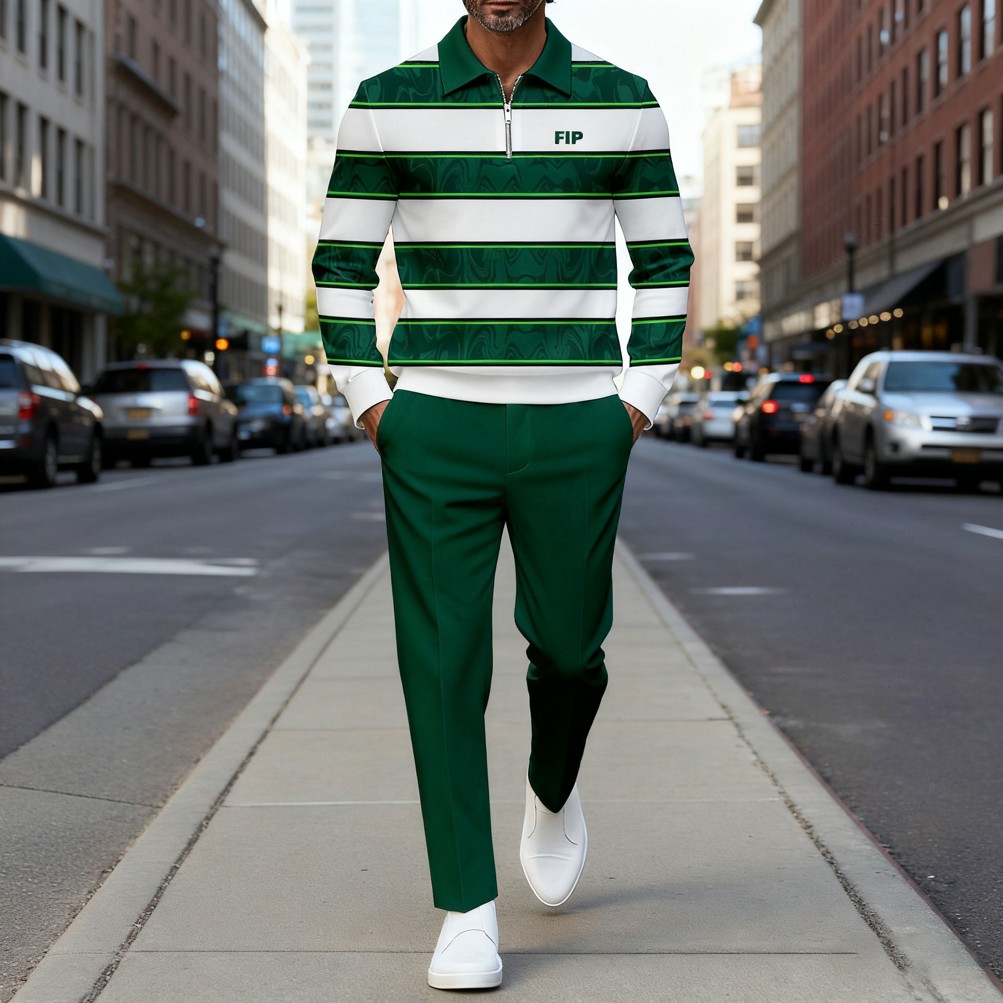 Men's Casual Green & White Color Matching Striped Printed Polo-Collar Zipper Long Sleeved Trousers Two-Piece Set