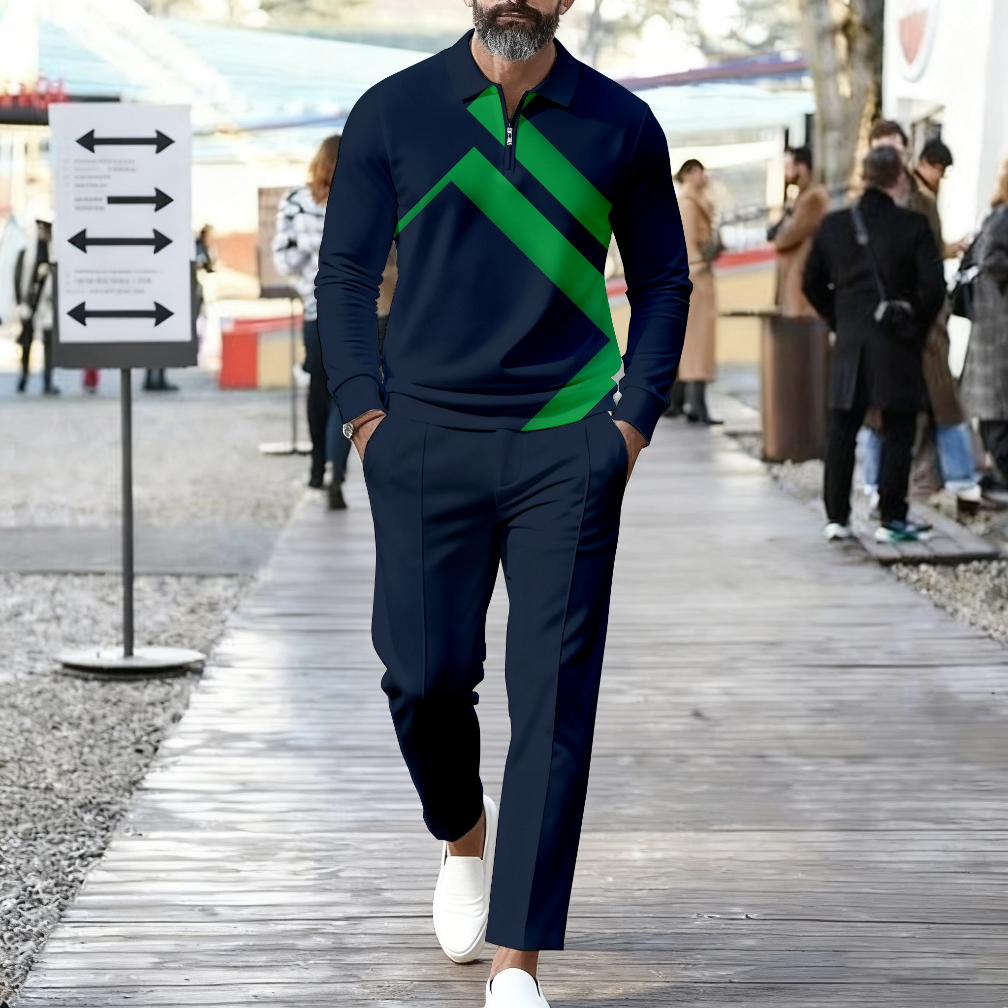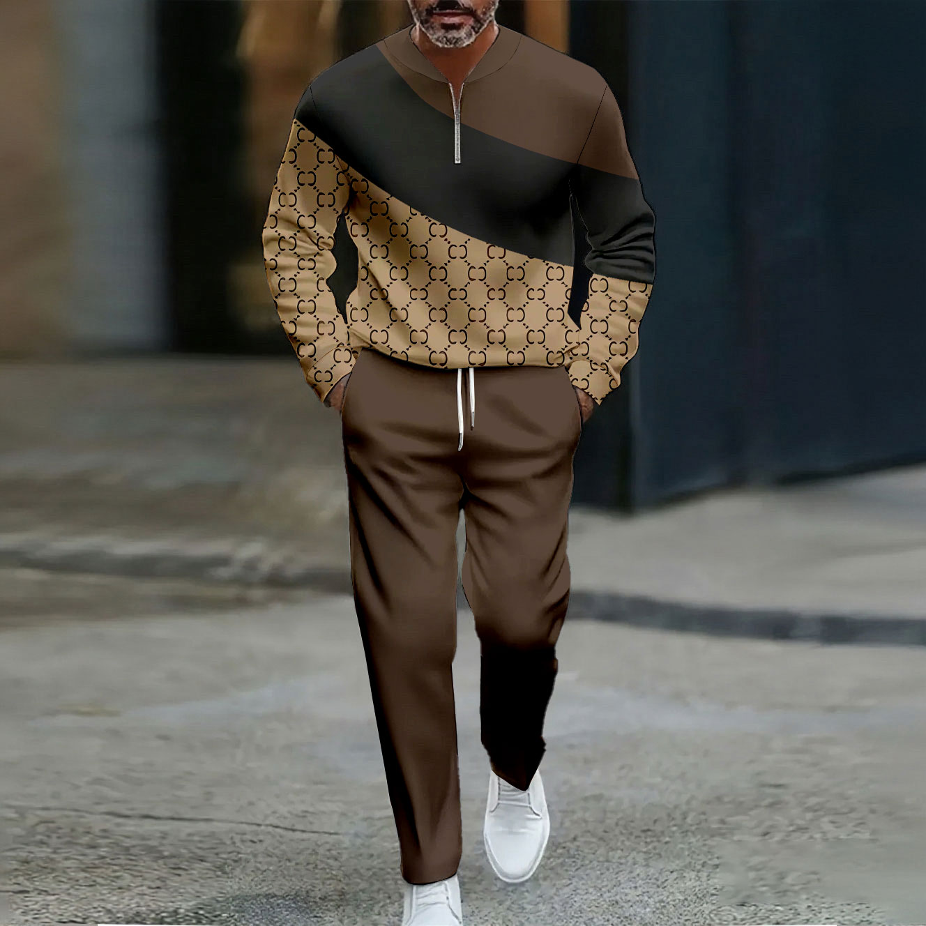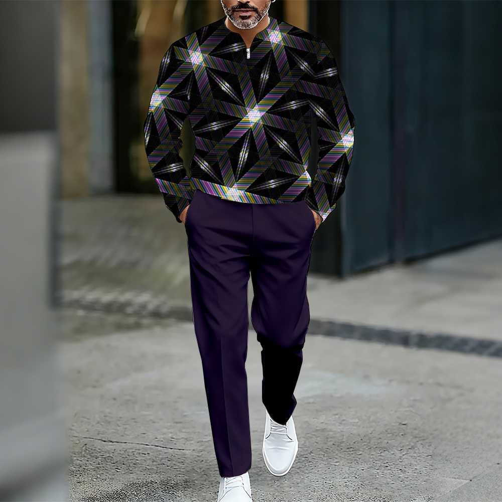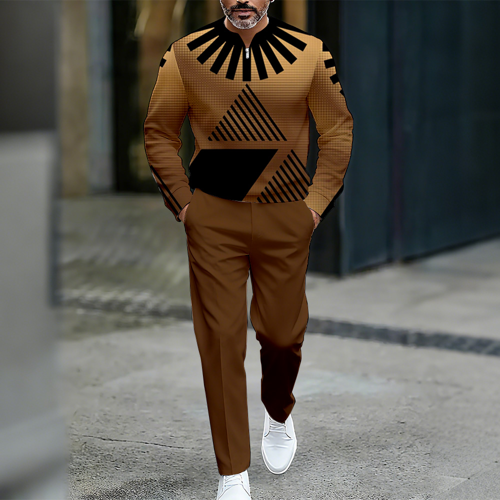 Men's Casual Color Matching Printed Polo-Collar Zipper Long Sleeved Trousers Two-Piece Set