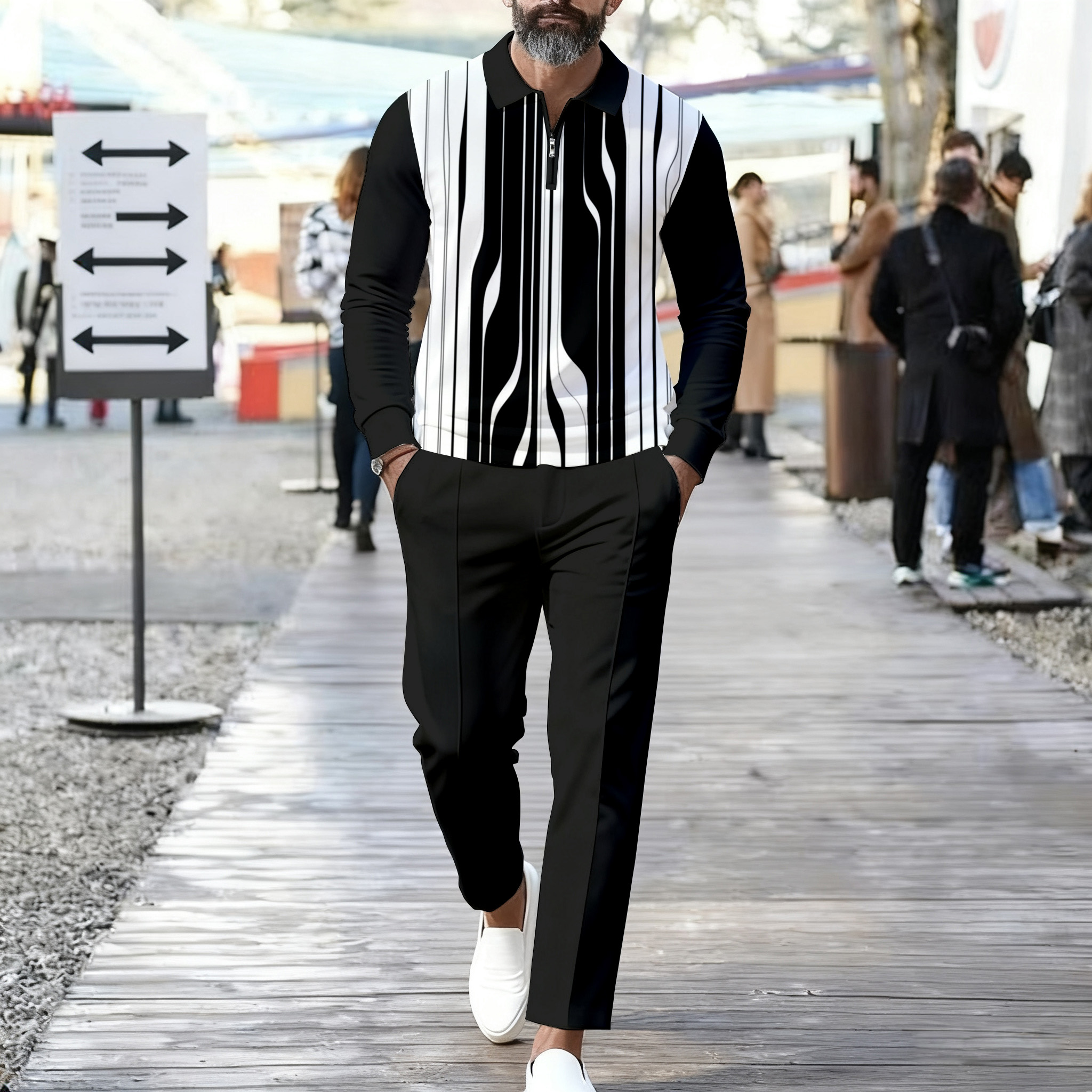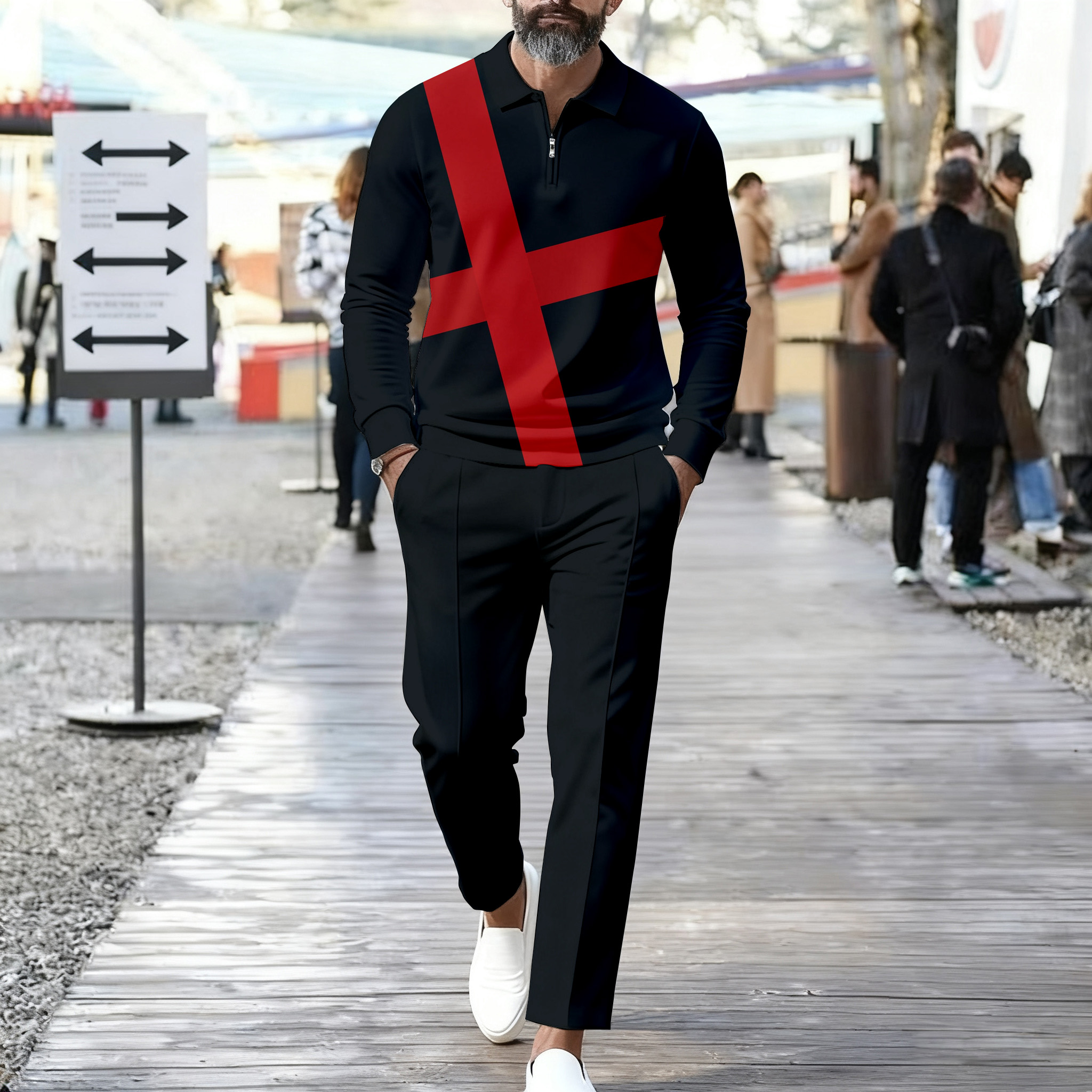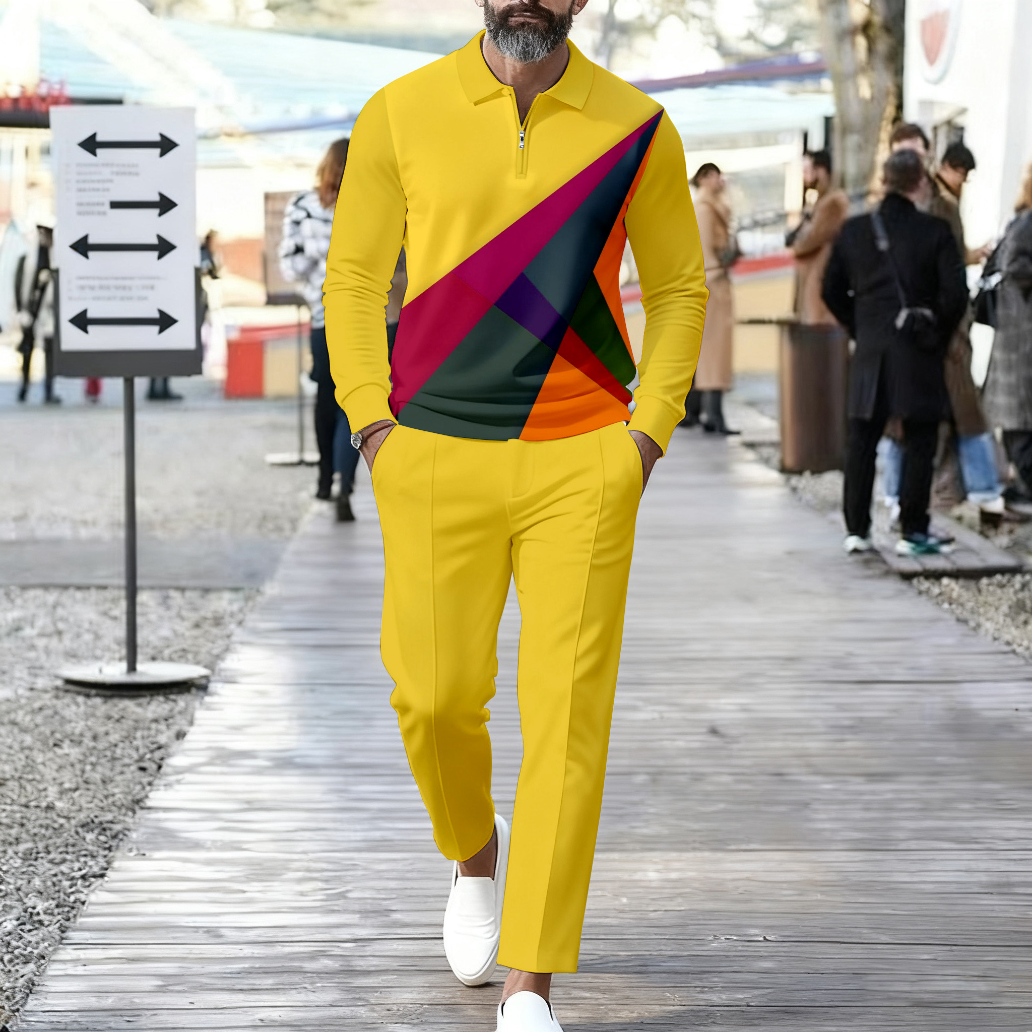 Men's Casual Color Matching Printed Polo-Collar Zipper Long Sleeved Trousers Two-Piece Set