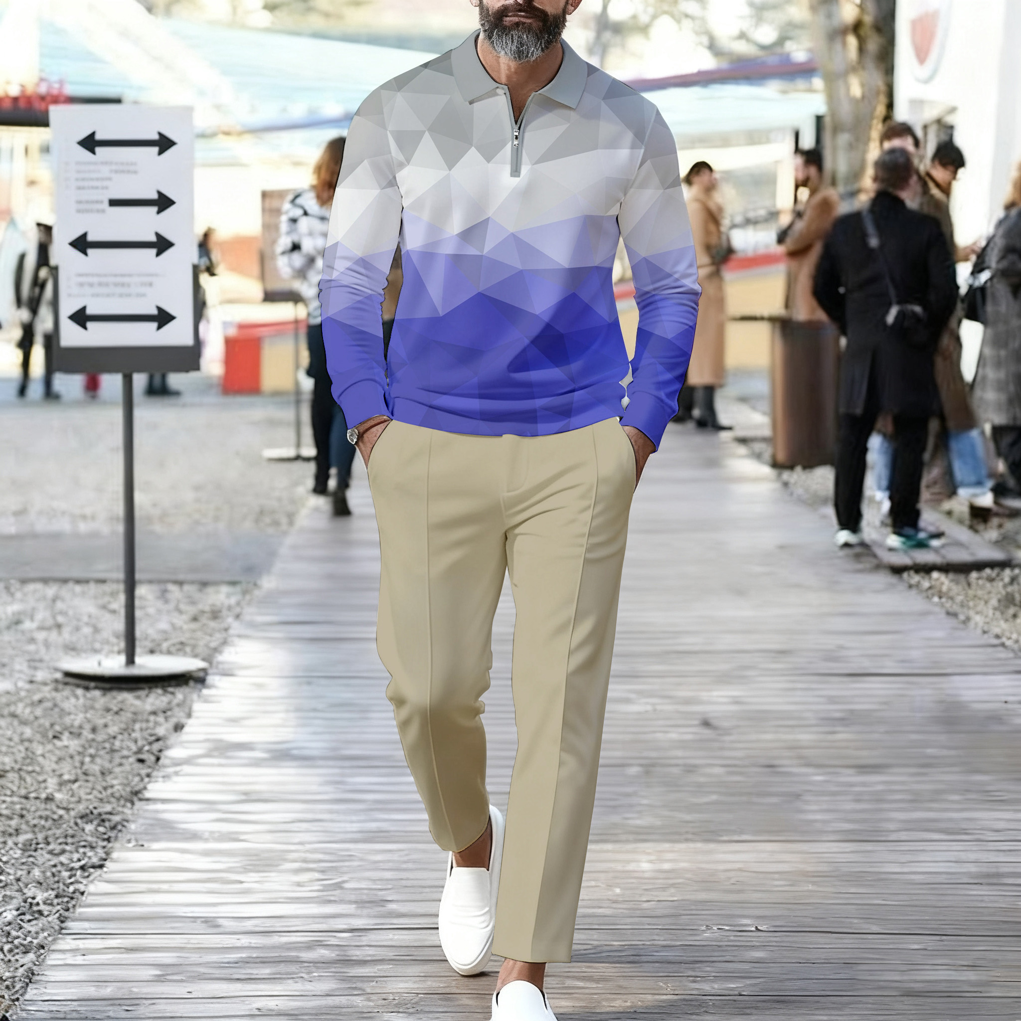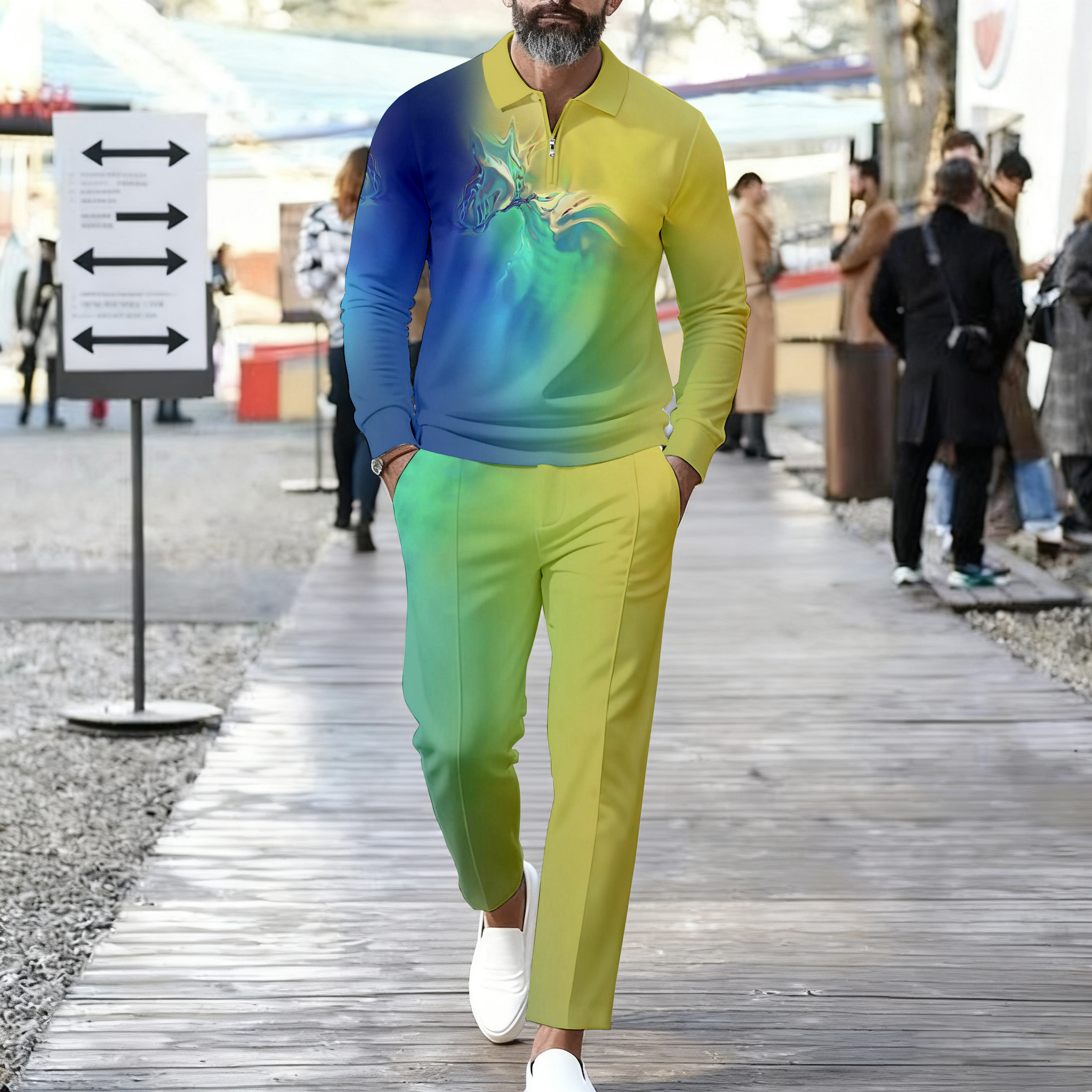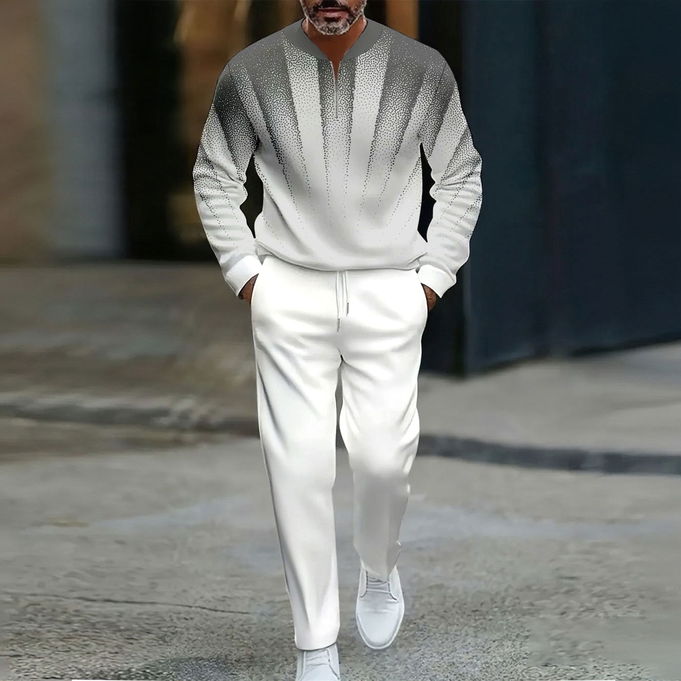 Men's Casual Gray Gradient Color Matching Printed Polo-Collar Zipper Long Sleeved Trousers Two-Piece Set