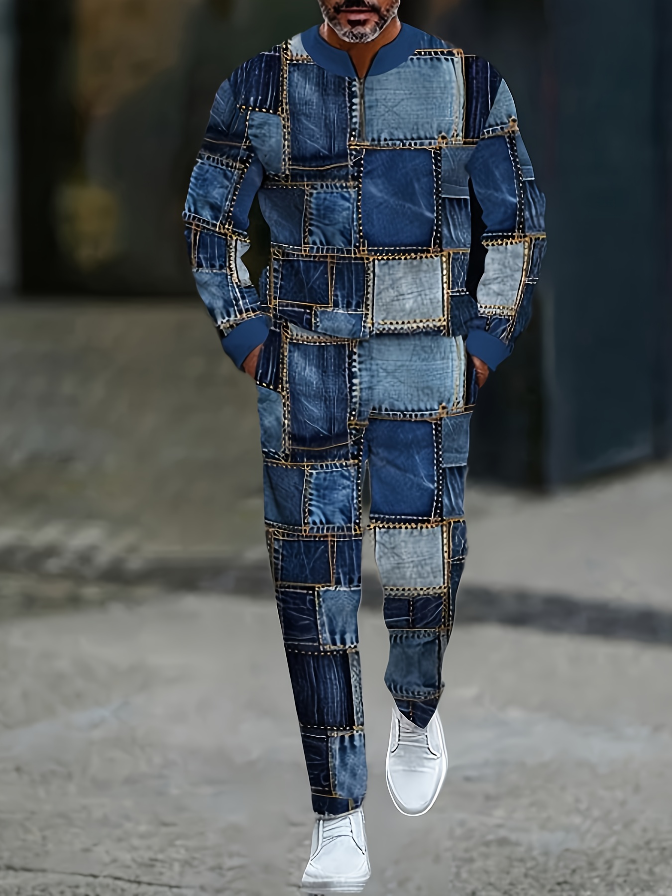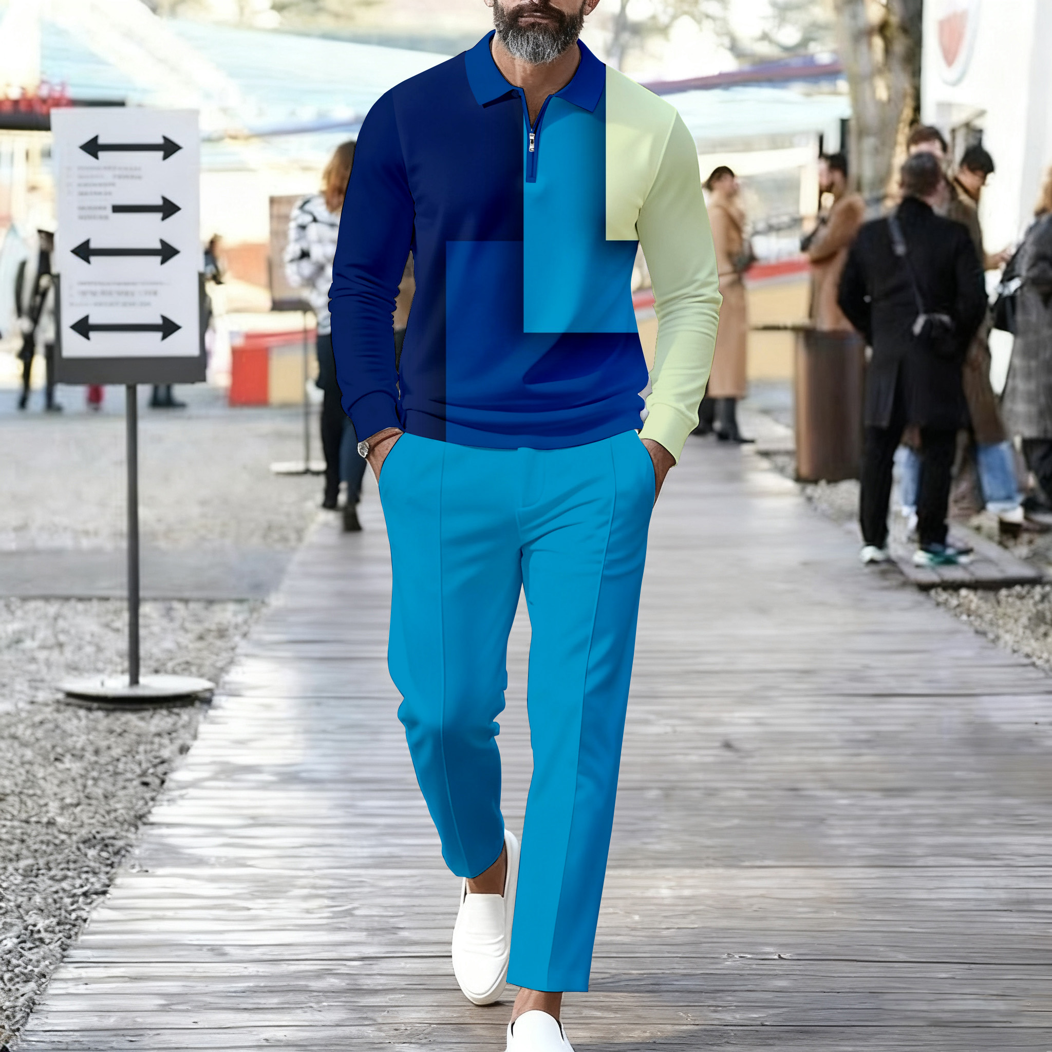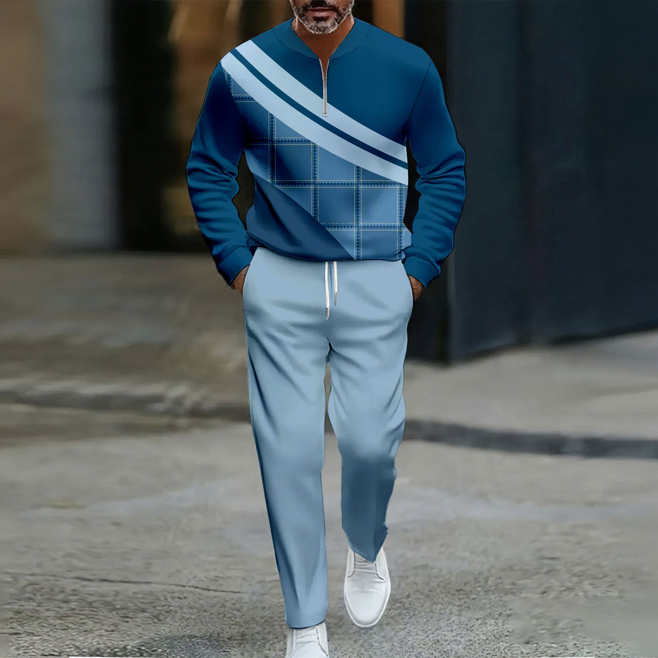 Men's Casual Blue Color Matching Printed Polo-Collar Zipper Long Sleeved Trousers Two-Piece Set