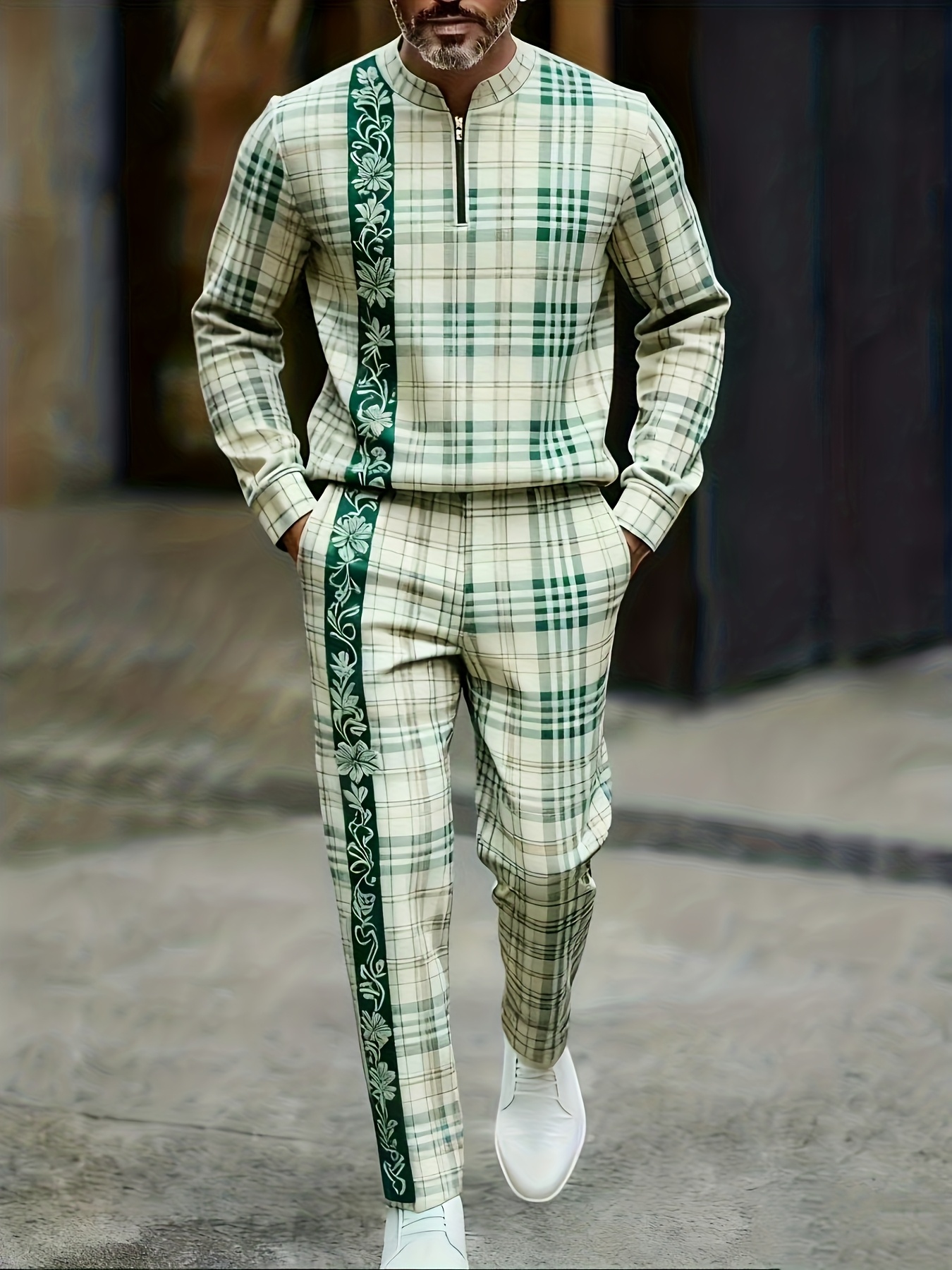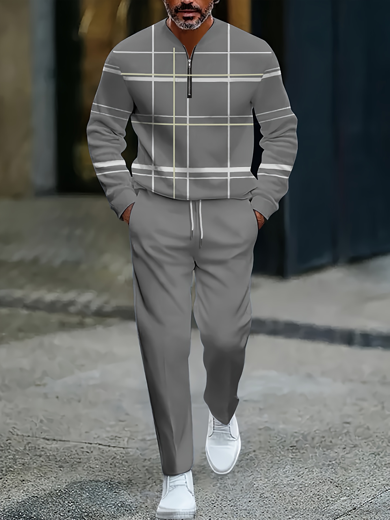 Men's Casual Color Matching Checked Printed Polo-Collar Zipper Long Sleeved Trousers Two-Piece Set