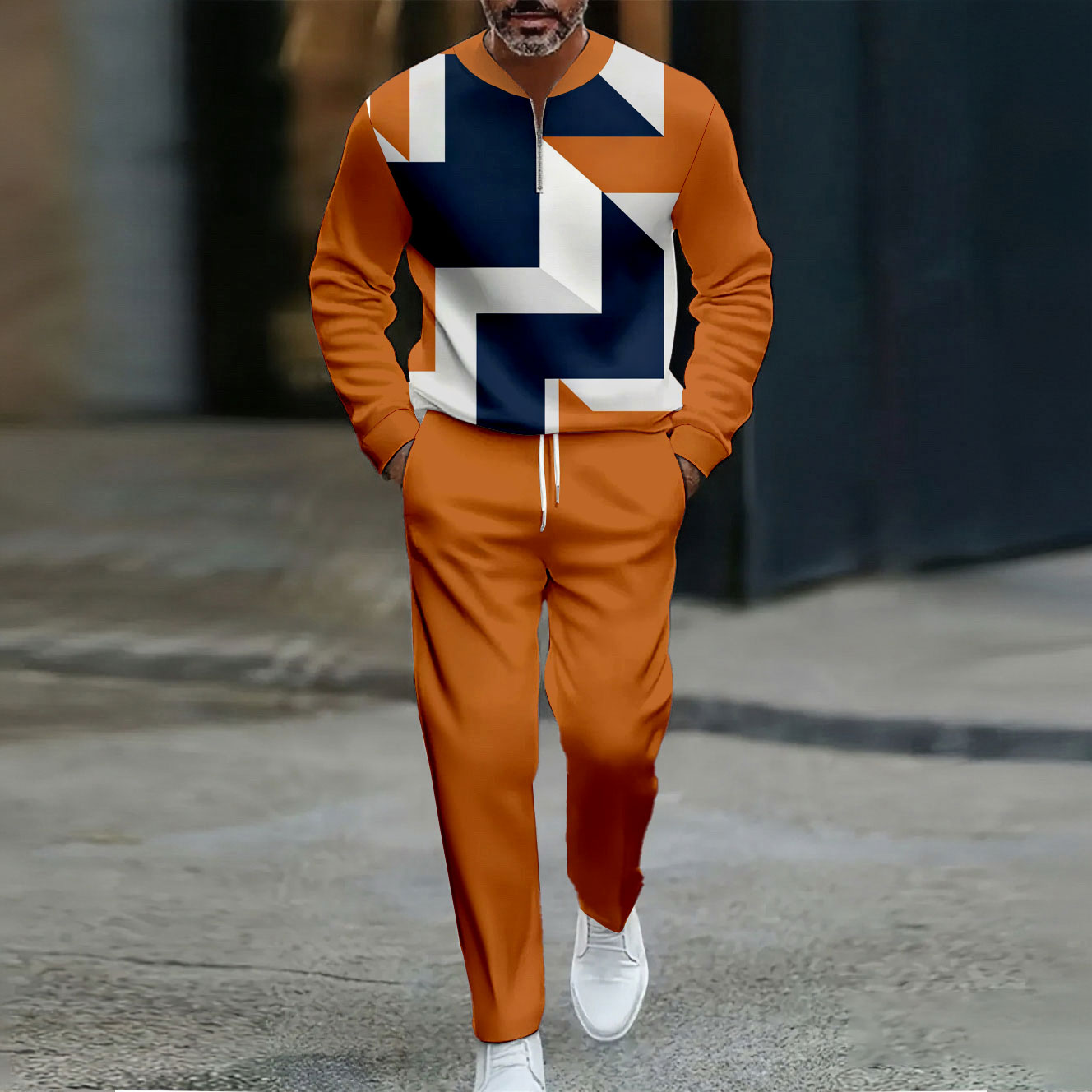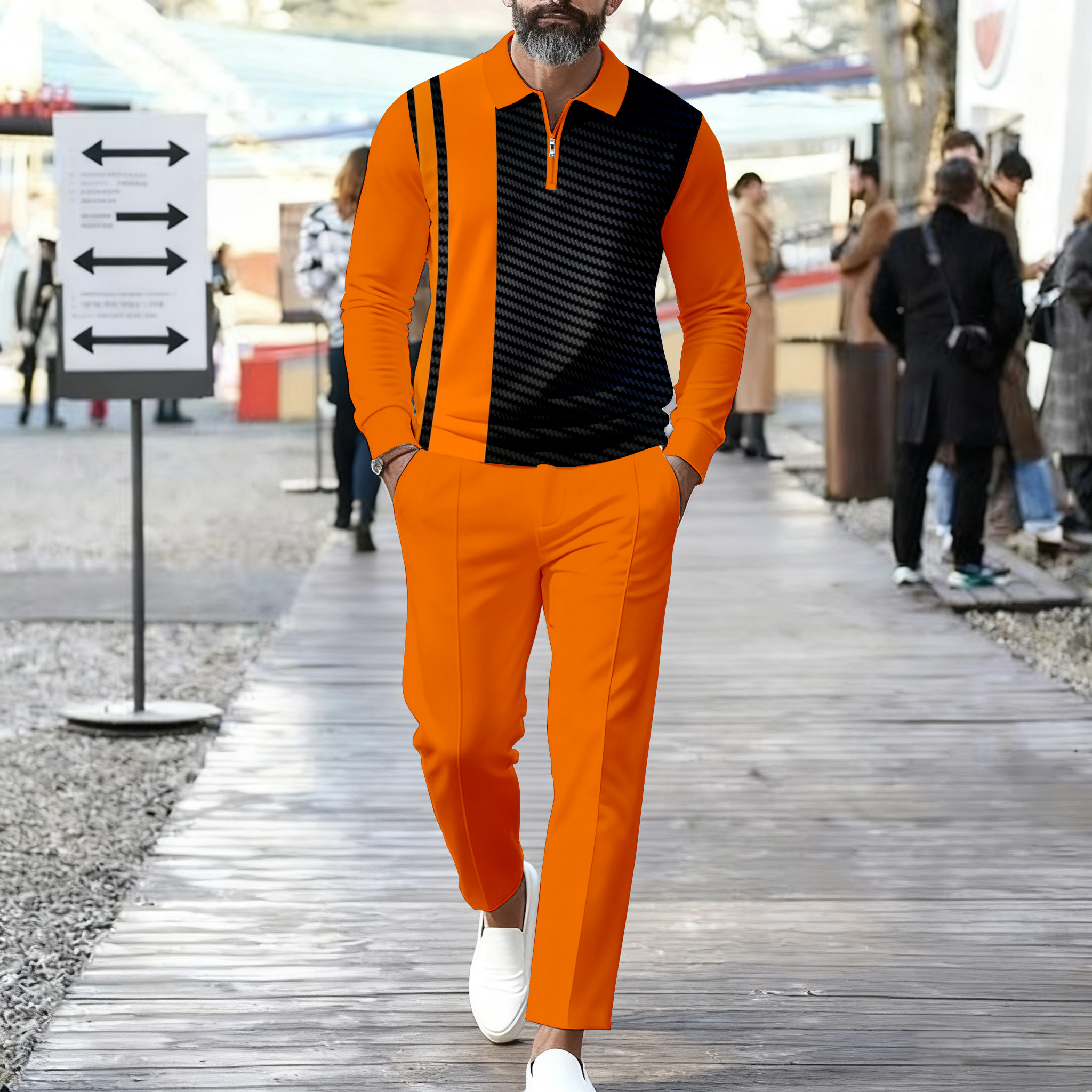 Men's Casual Orange Color Matching Geometric Printed Polo-Collar Zipper Long Sleeved Trousers Two-Piece Set