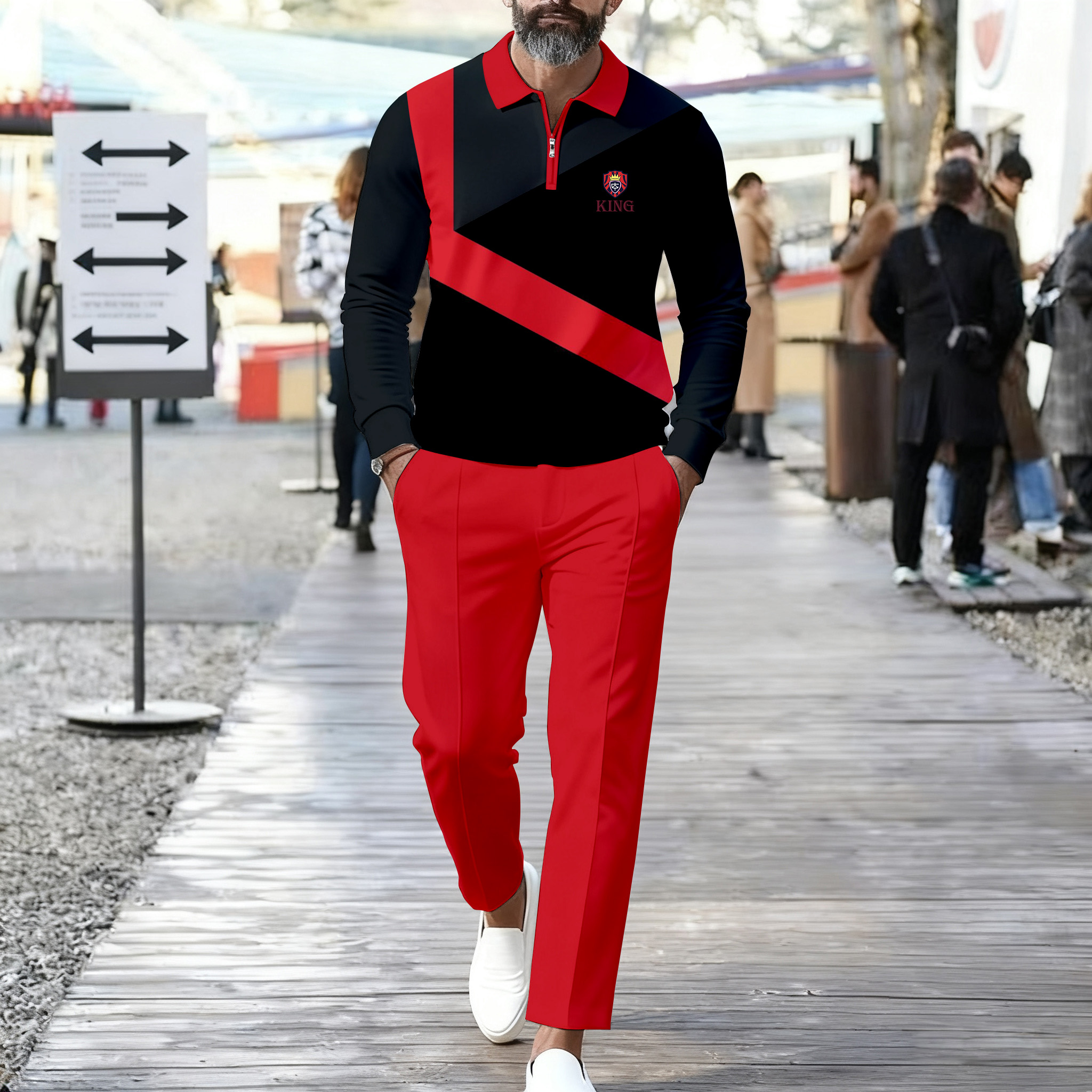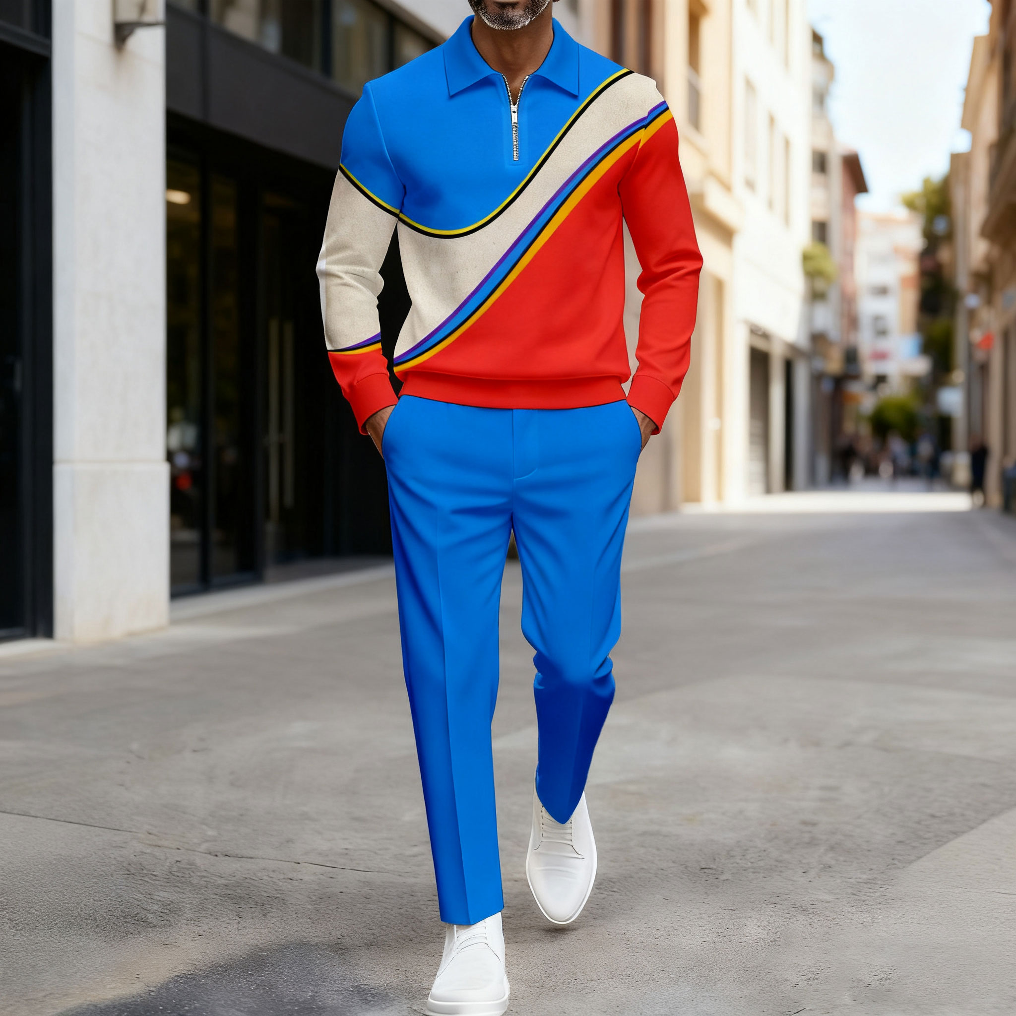 Men's Casual Red & Blue Color Matching Asymmetric Printed Polo-Collar Zipper Long Sleeved Trousers Two-Piece Set