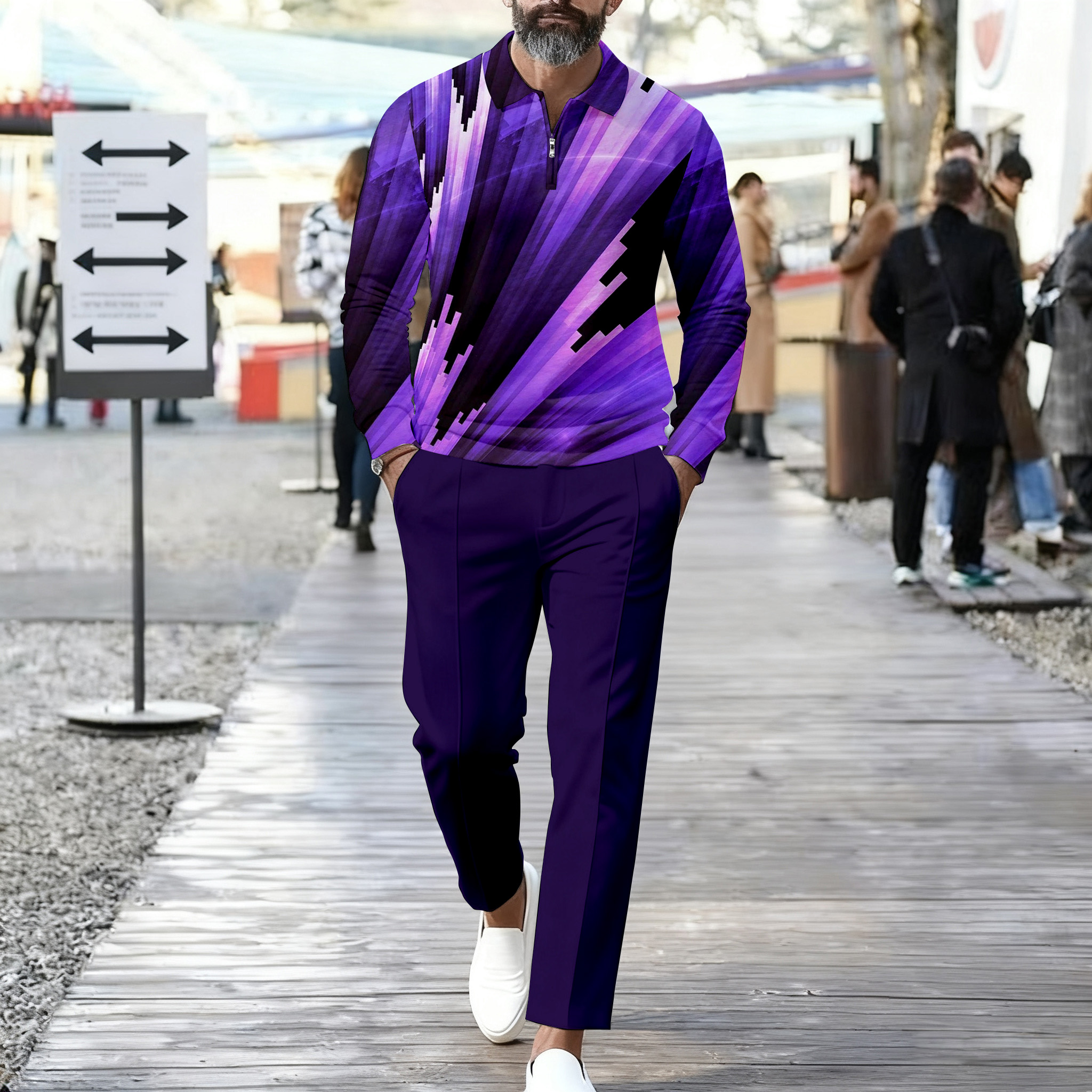 Men's Casual Purple Gradient Color Matching Printed Polo-Collar Zipper Long Sleeved Trousers Two-Piece Set