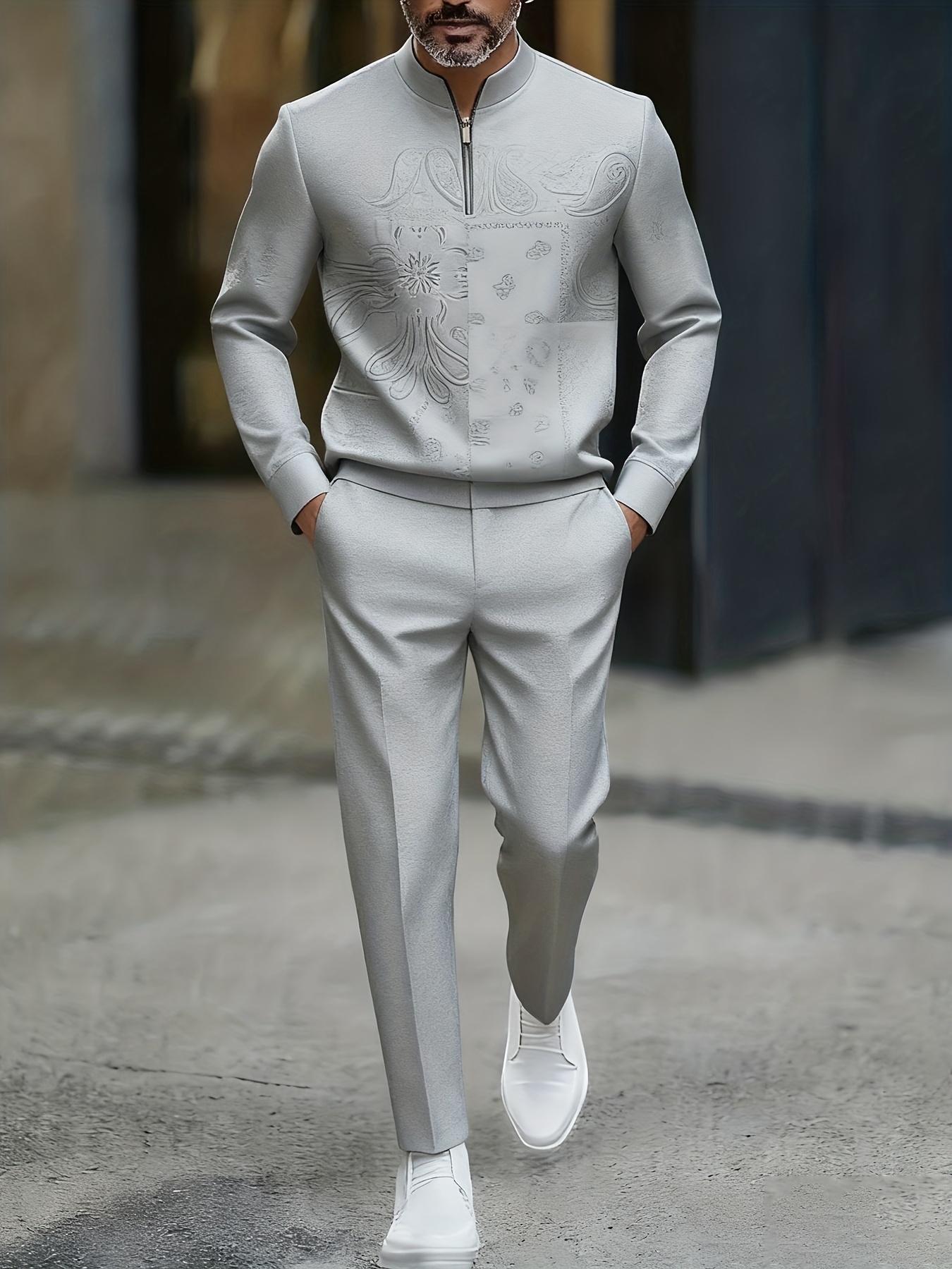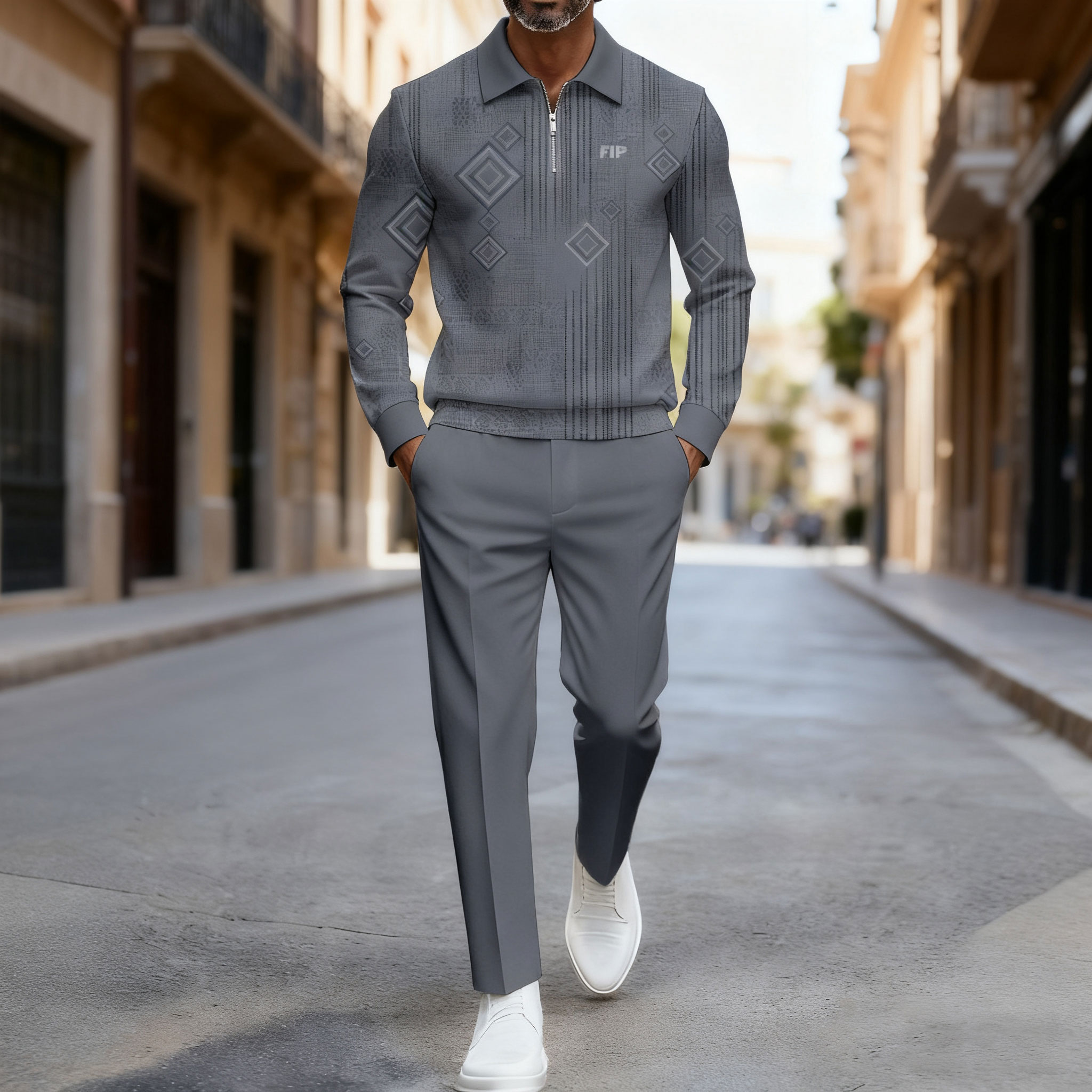 Men's Casual Gray Color Matching Geometric Printed Polo-Collar Zipper Long Sleeved Trousers Two-Piece Set