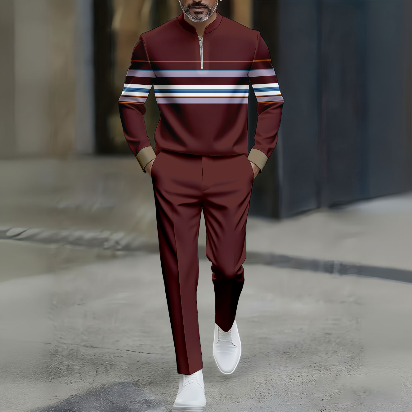 Men's Casual Color Matching Striped Printed Round-Neck Zipper Long Sleeved Trousers Maroon Two-Piece Set