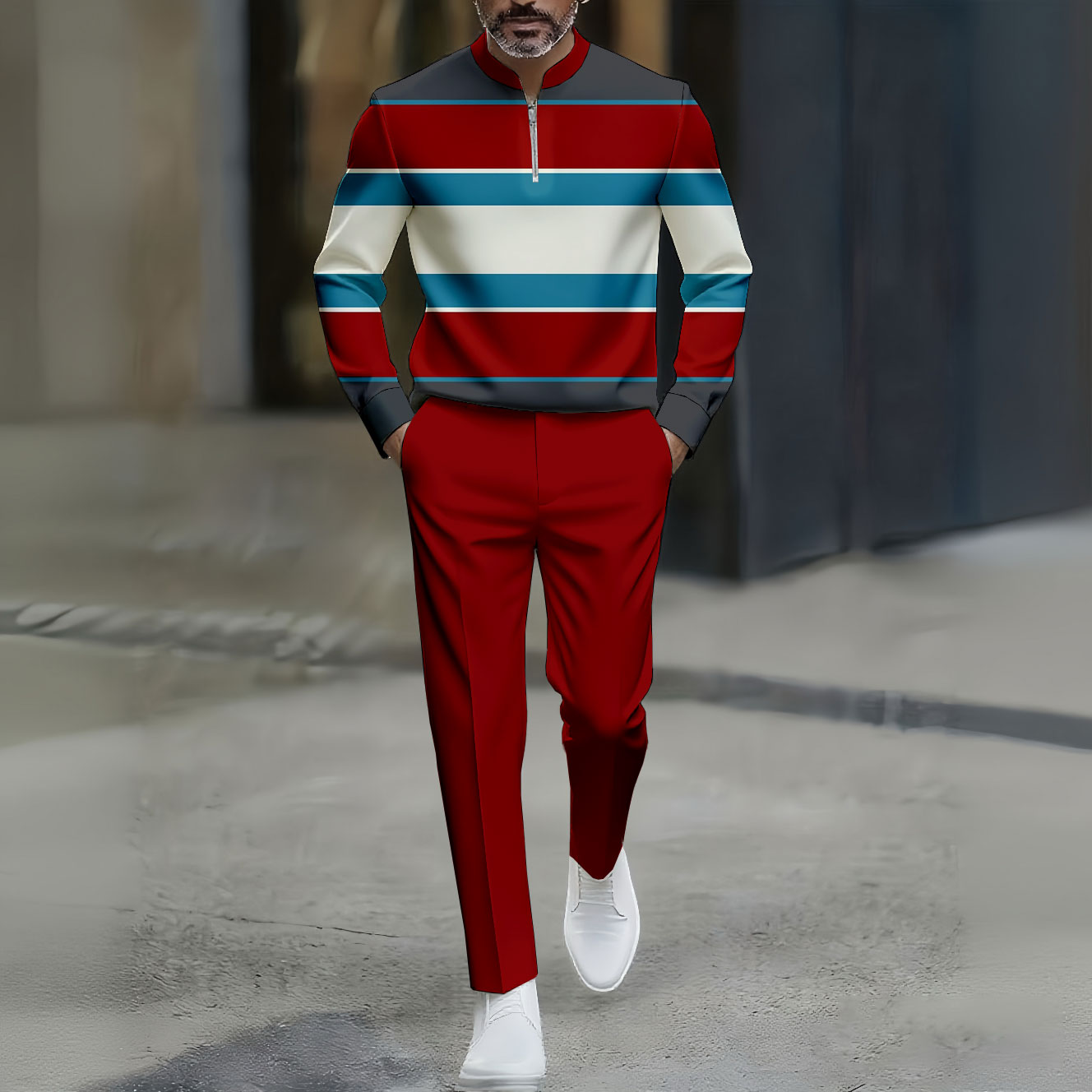 Men's Casual Color Matching Striped Printed Round-Neck Zipper Long Sleeved Trousers Red Two-Piece Set