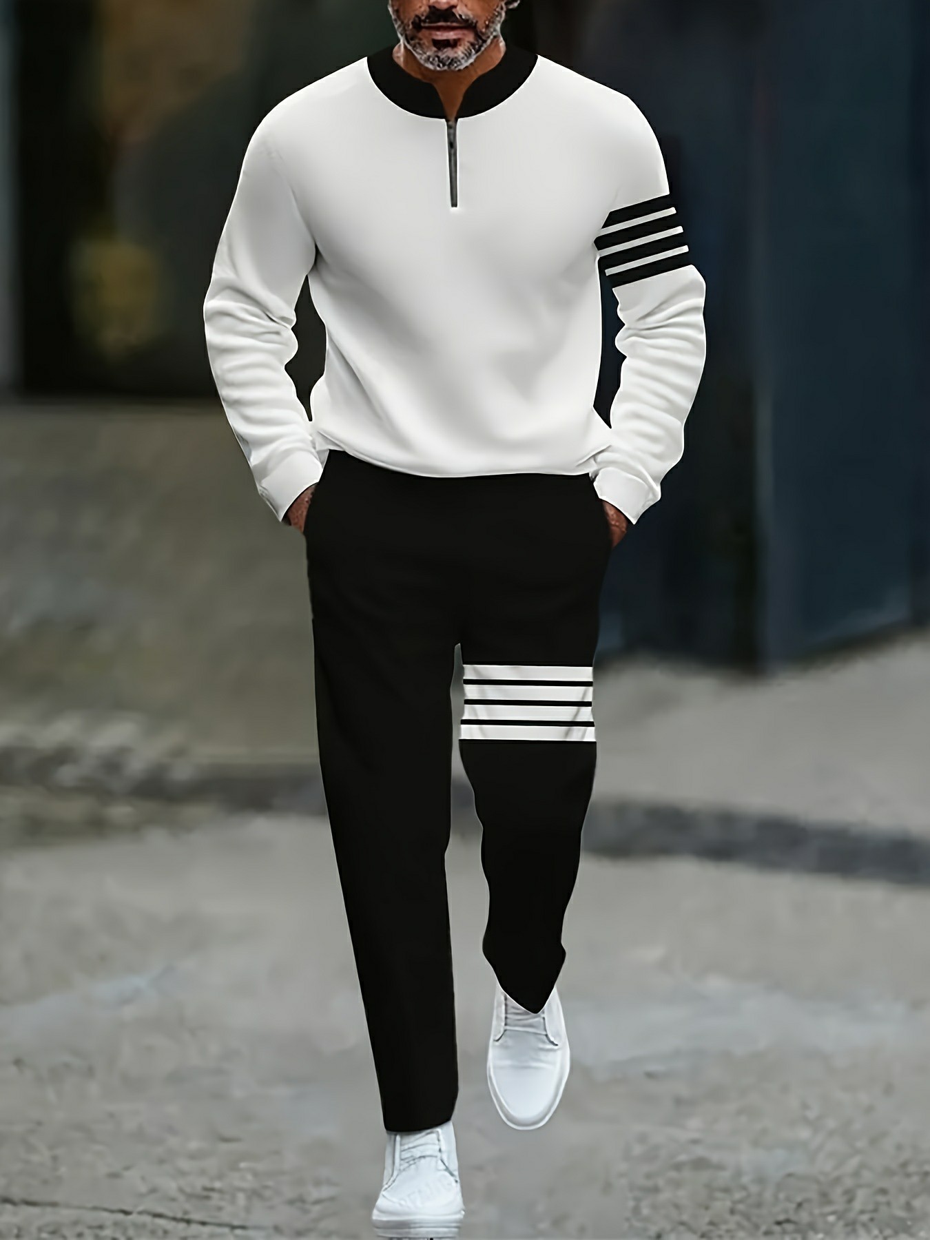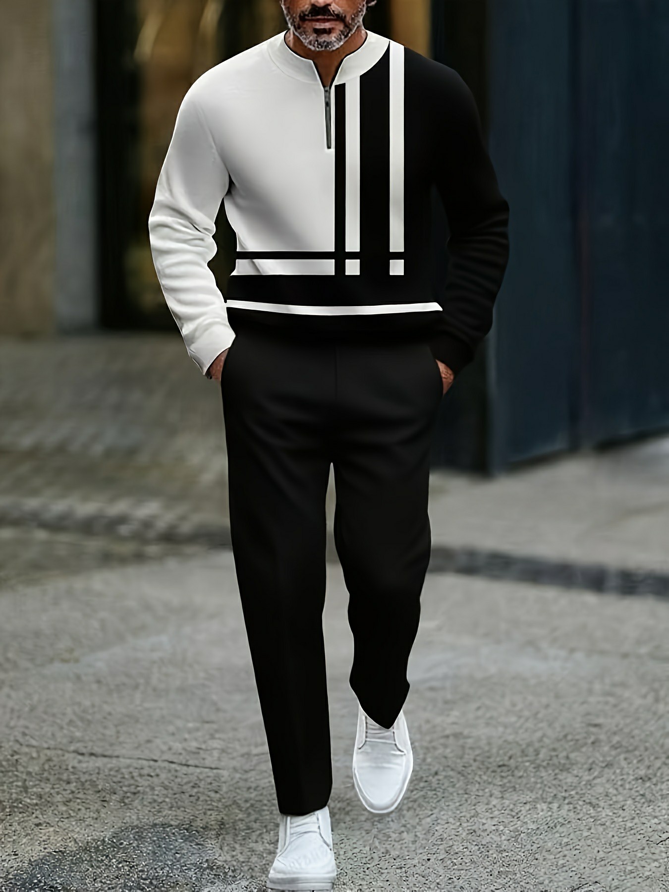 Men's Casual Black & White Color Matching Striped Printed Round-Neck Zipper Long Sleeved Trousers Two-Piece Set