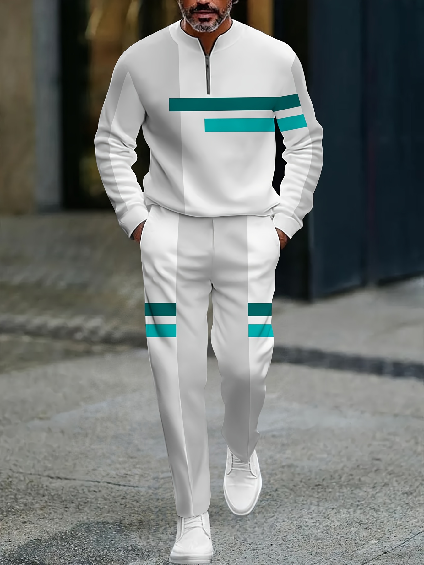 Men's Casual Green & White Color Matching Geometric Printed Round-Neck Zipper Long Sleeved Trousers Two-Piece Set