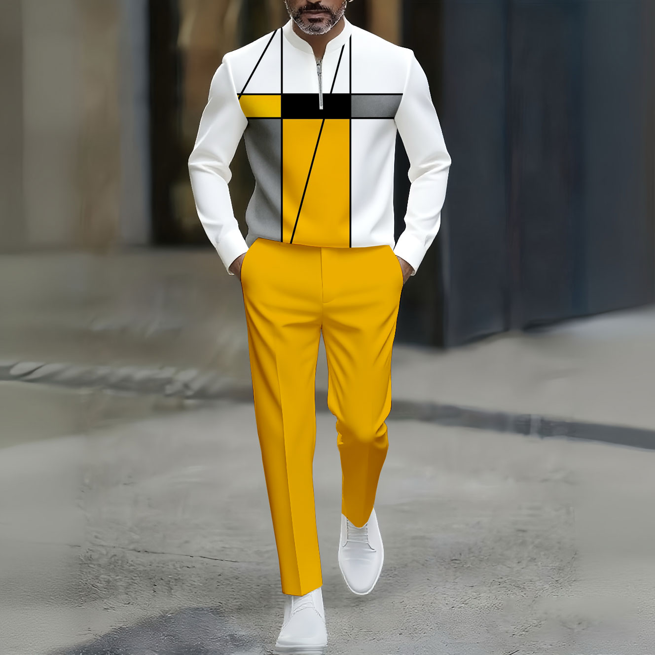 Men's Casual Yellow & White Color Matching Geomectric Printed Round-Neck Zipper Long Sleeved Trousers Two-Piece Set
