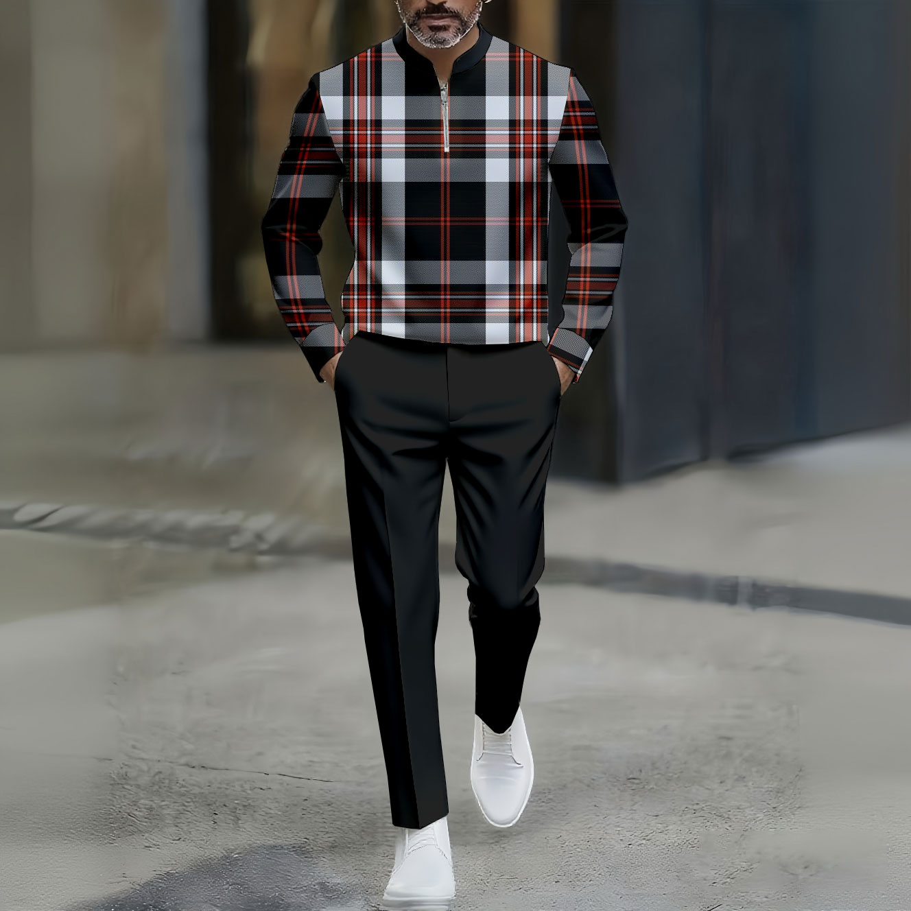 Men's Casual Red&Black Color Matching Checked Printed Round-Neck Zipper Long Sleeved Trousers Two-Piece Set