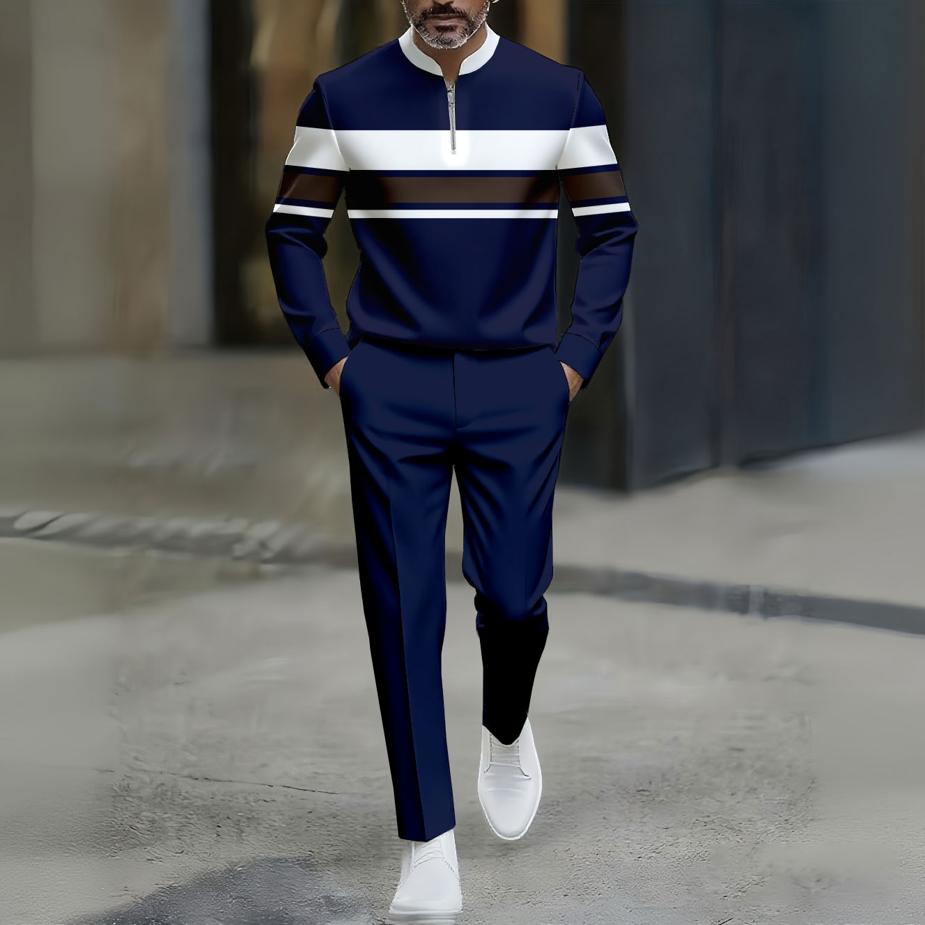 Men's Casual Color Matching Striped Printed Round-Neck Zipper Long Sleeved Navy Blue Trousers Two-Piece Set