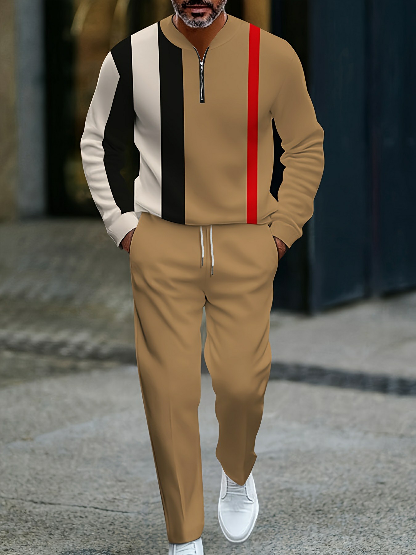 Men's Casual Color Matching Striped Printed Round-Neck Zipper Long Sleeved Trousers Orange Brown Two-Piece Set