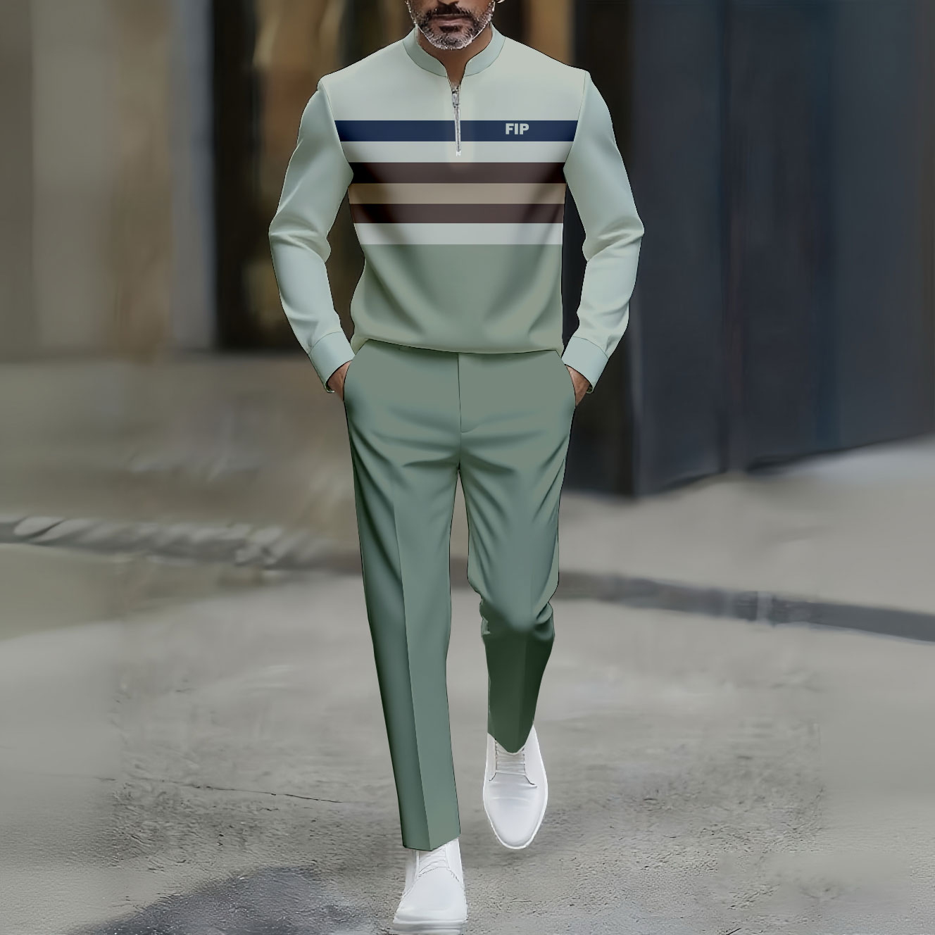 Men's Casual Green Color Matching Striped Printed Round-Neck Zipper Long Sleeved Trousers Two-Piece Set