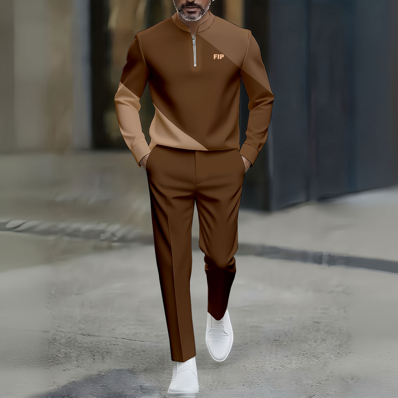Men's Casual Brown Color Matching Geometric Printed Round-Neck Zipper Long Sleeved Trousers Two-Piece Set