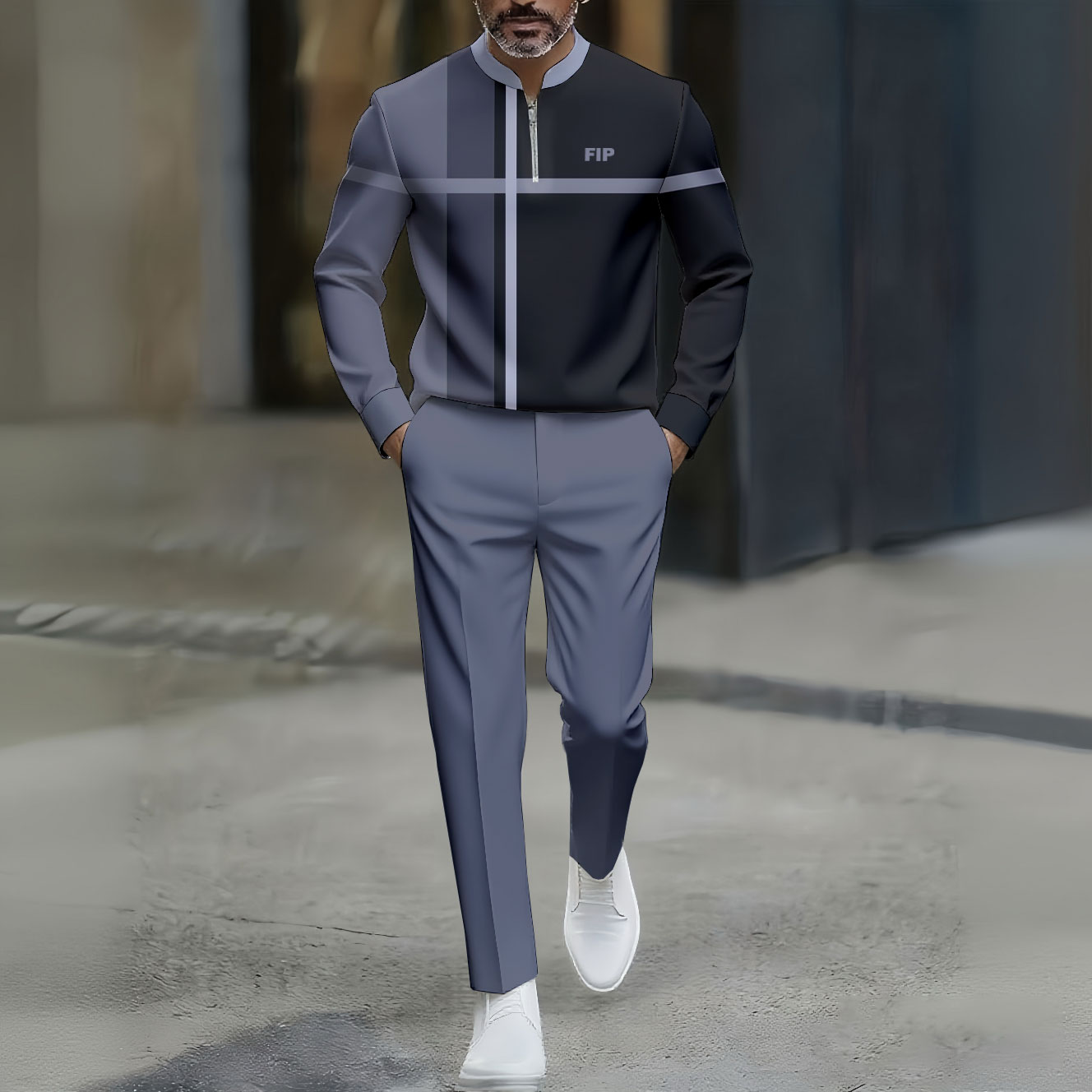 Men's Casual Gray Blue Color Matching Geometric Printed Round-Neck Zipper Long Sleeved Trousers Two-Piece Set
