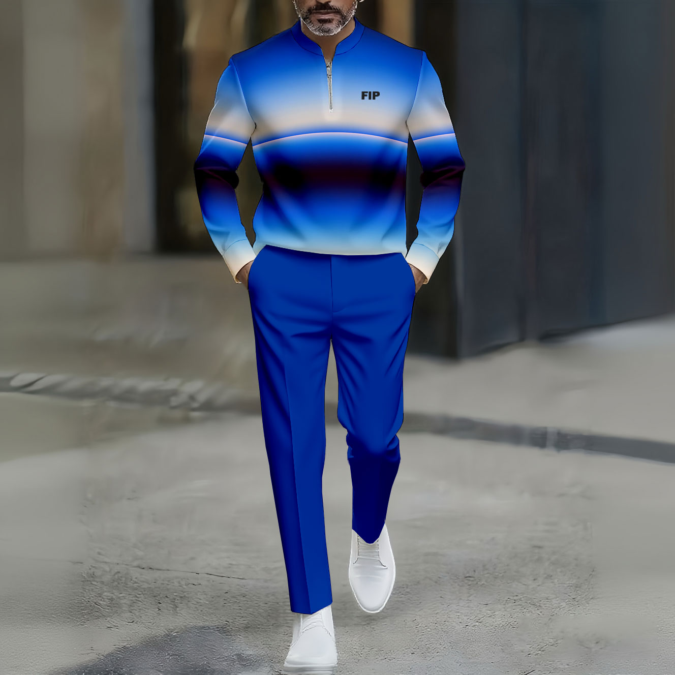 Men's Casual Blue Gradient Color Matching Striped Printed Round-Neck Zipper Long Sleeved Trousers Two-Piece Set