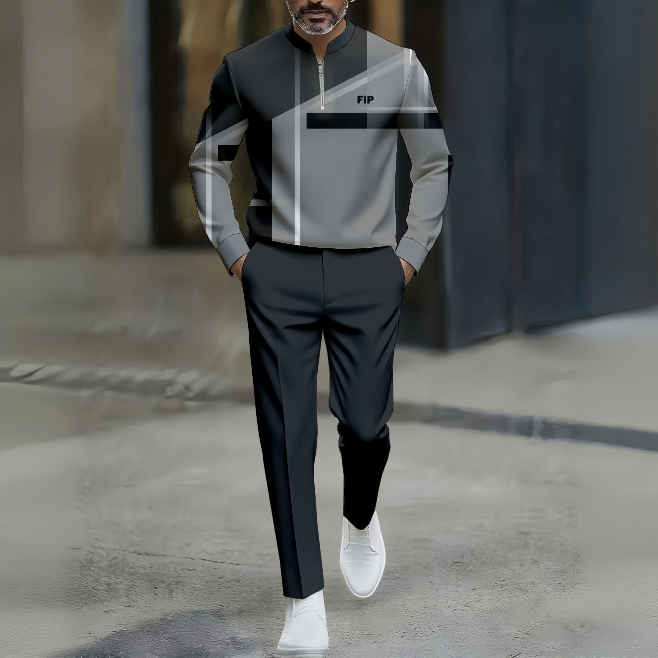 Men's Casual Gray&Black Color Matching Printed Round-Neck Zipper Long Sleeved Trousers Two-Piece Set