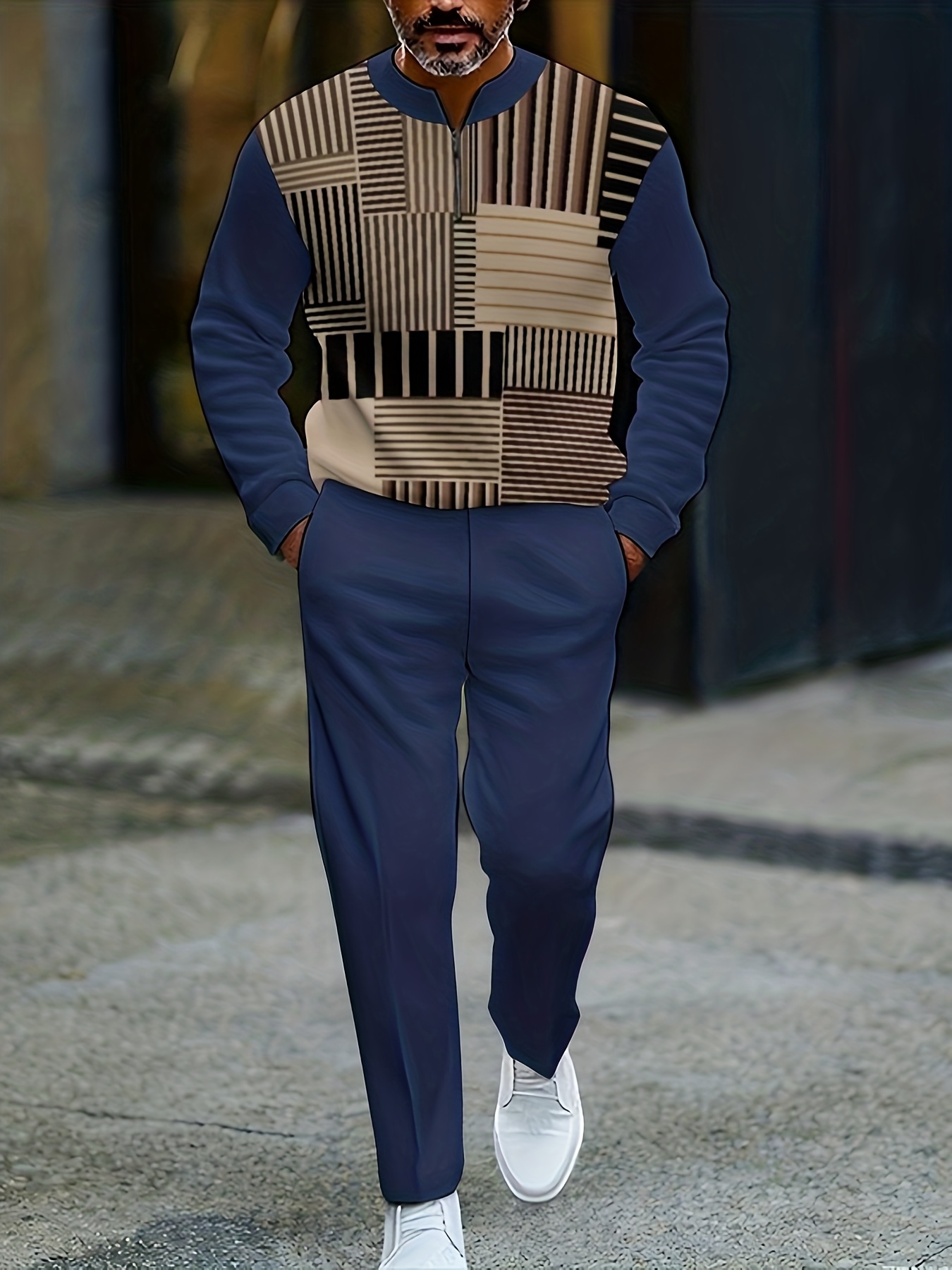 Men's Casual Navy Blue Color Matching Geometric Printed Round-Neck Zipper Long Sleeved Trousers Two-Piece Set