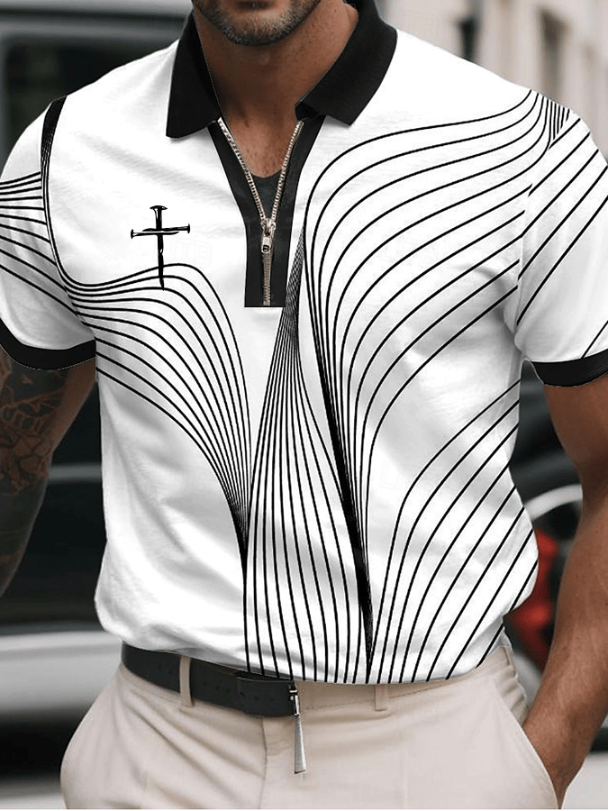 Men's Business Casual Striped Zip-Up Polo Shirt