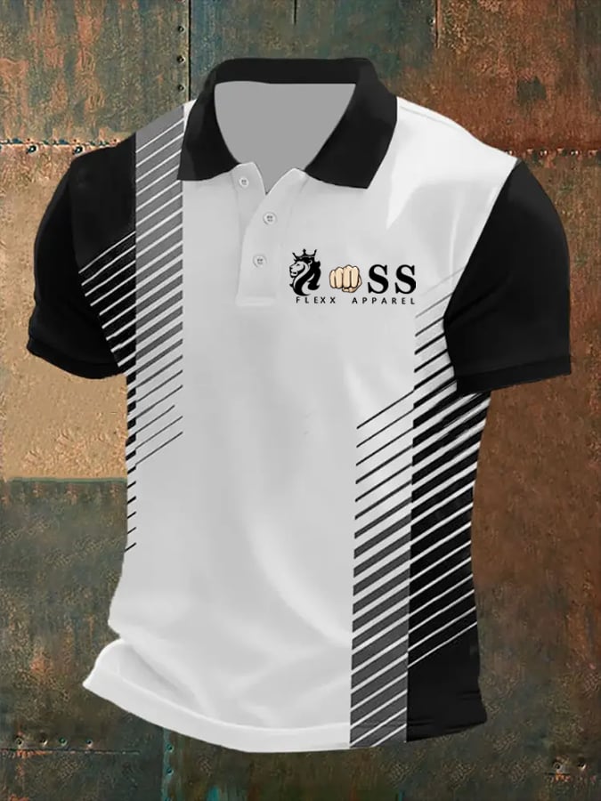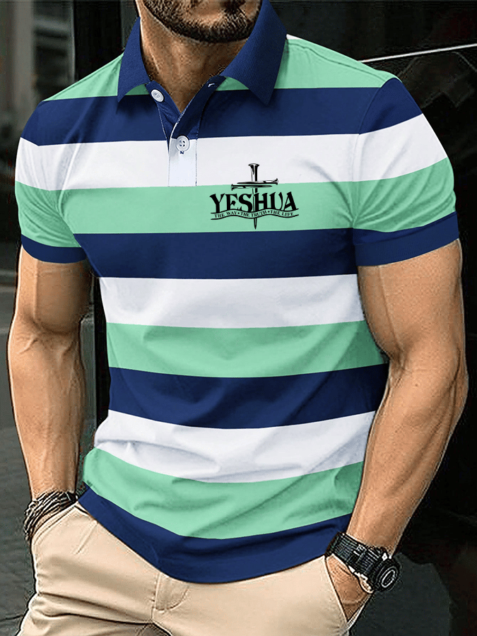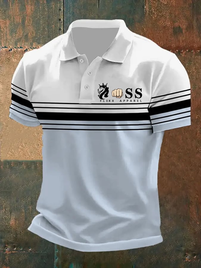 Men's Business Stripe Lettering Button-Down Polo Shirt